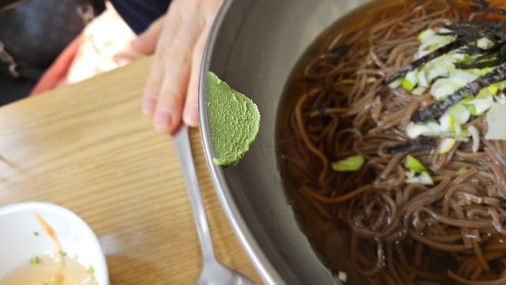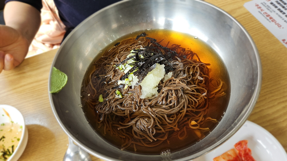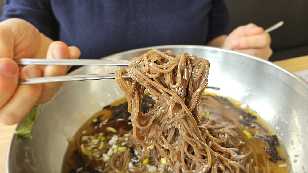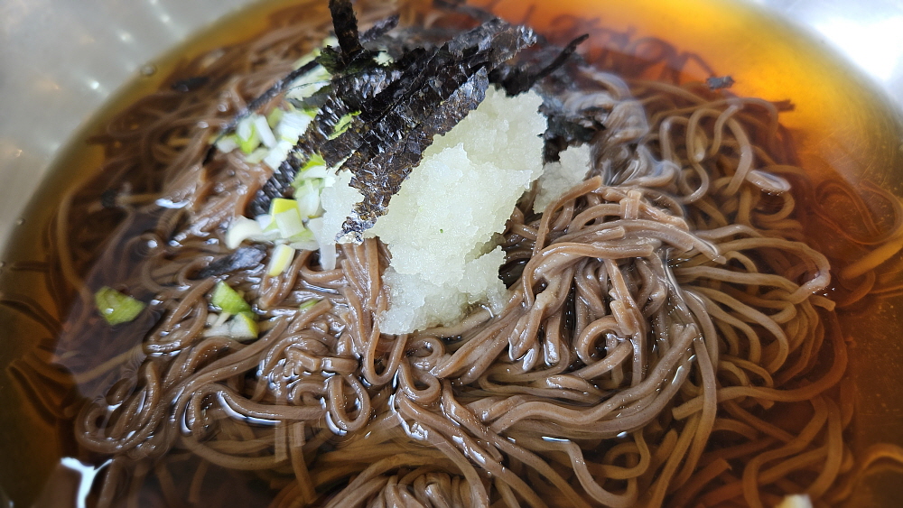 사람에 따라 취향이 다를 수 있지만 일단 나온 돈가스를 잘게 잘라 놓았다. 마치 돈가스 안주를 대하는 사람의 심정으로 아주 정성껏 잘랐다. 자르면서 보니 돈가스의 두께가 예술적으로 얇았다. 이러면 크기는 커 보이지만 먹을 때 부담이 없다. 바삭하게 잘 튀겨진 돈가스를 먹는 맛은 고소함과 바싹함의 완벽한 조화라 하겠다. 듬뿍 뿌려진 소스도 한 몫을 했다. 바로 이런 돈가스를 그렇게나 원했던 것이다. 어릴적 기억을 소환하는 아주 이상적인 돈가스라 하겠다. 우리는 추억을 함께 먹은 셈이다. 함께 주문한 메밀국수도 나왔다. 일본식과 한국식을 절묘하게 절충한 우리식의 메밀 국수였다.