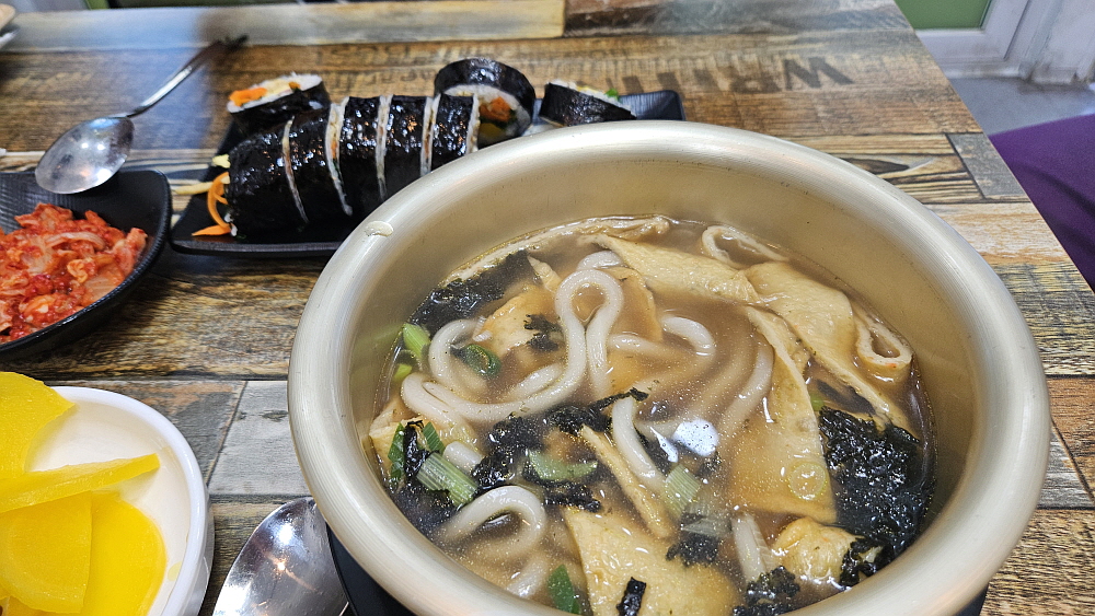 김밥이야기의 실내는 작은 편이다. 테이블이 서 너 개밖에 없다. 하지만 그래서 더 정겹고, 편안하다. 맘씨 좋은 주인장의 밝은 미소가 있어 더욱 그렇다. 우리는 이집의 특징이라는 땡초김밥과 시그니쳐인 김밥, 그리고 냄비 우동을 주문했다. 냄비 우동이라는 말도 오랫만에 듣는 것이다. 가락 우동이라고도 불리는 분식계의 대표 주자격인 면 음식인데 어릴적에도 여행을 가거나 나들이를 갈 때 자주 먹곤 했다. 굵은 면발이 정겹고, 담백하지만 깊은 맛의 국물은 가슴까지 적셔준다. 이집은 김밥을 그 때 그 때 말아주는데 그래서 조금 기다리는 시간이 필요하다. 대신 훨씬 맛이 좋다.