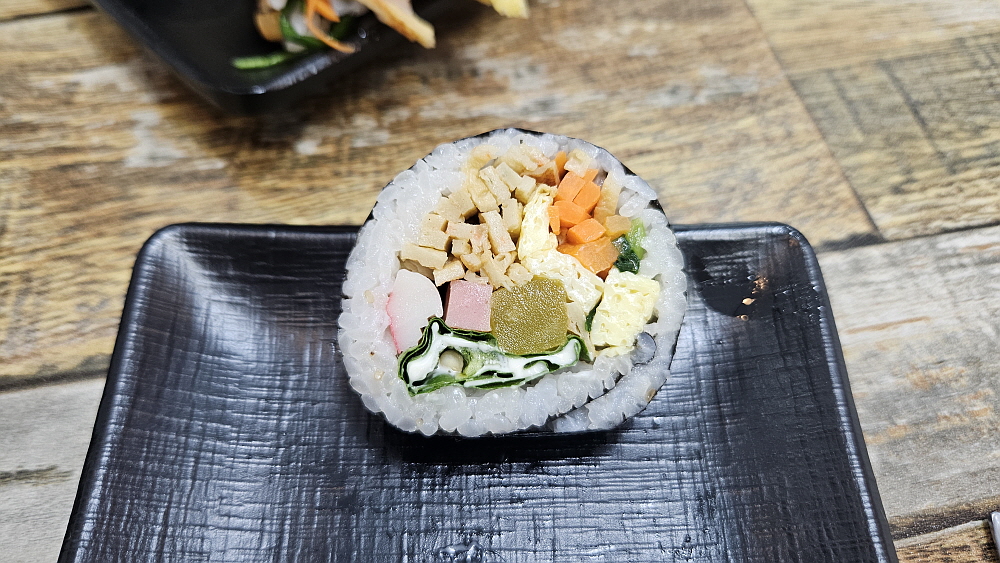땡초 김밥의 속 중에 과연 무엇이 이렇게 눈물 날 정도의 매움을 던지는 것인지 살펴 보았다. 그런 모습이 재미있었던지 주인장께서 와서 파랗게 말려 있는 야채가 바로 그 땡초 맛의 비밀부위라 말해 주었다. 그래도 땡초 고추의 정말 매운 부분인 씨는 빼고 소스와 함께 만든 것이란다. 씨를 뺐는데도 이렇게나 맵다니 맵질이가 맞긴 맞나 보다. 밥이 넉넉하게 들어 있어 망정이지 아니라면 정말 눈물 콧물 다 쏟을 뻔 했다. 요즘 김밥들은 개성도 강하고, 아이템도 다양해져 먹는 사람이 다채롭게 즐길 수 있다. 이런 저런 다른 종류의 김밥을 주문하여 먹는 재미가 쏠쏠하다.