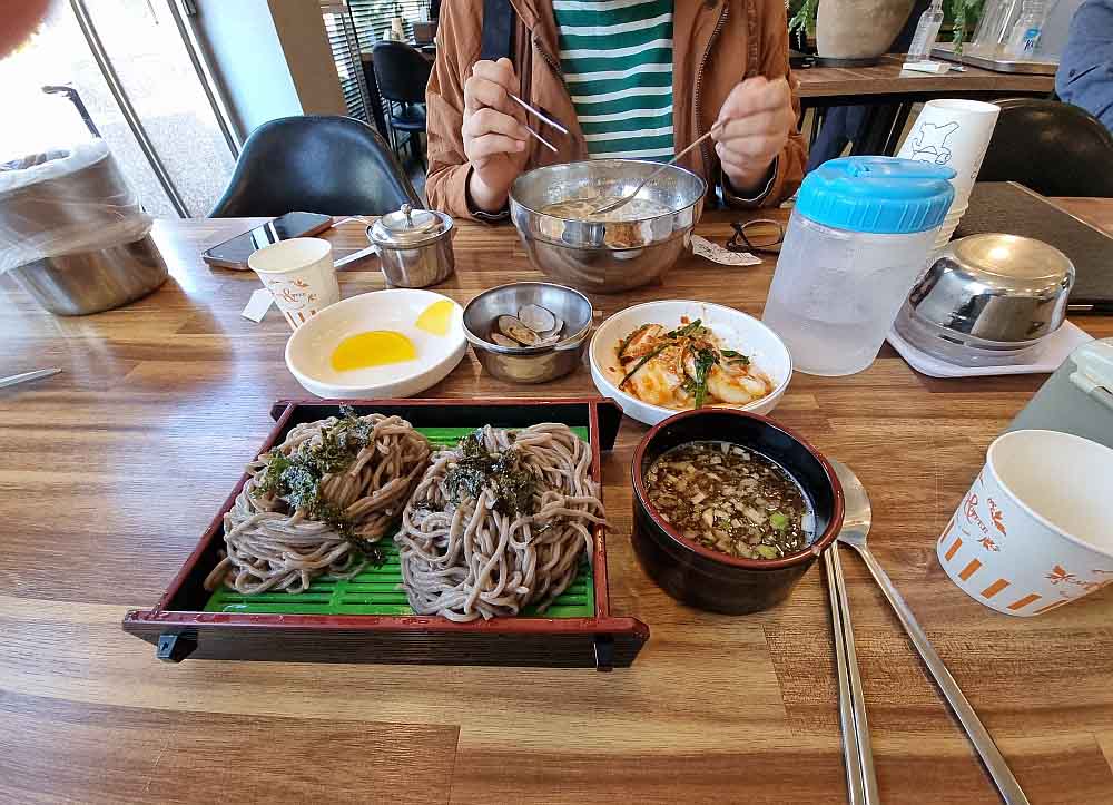 그래서 우리가 들린 곳은 문경시의 도가네 칼국수라는 집이었다. 문경시청 바로 앞에 있는 아담한 식당으로 검색에 검색을 거듭한 끝에 얻은 귀한 결론의 집이었다. 몇 년 전 문경시청에 왔다가 근처에서 밥도 먹고 잠도 자고 했던 기억이 있다. 그 때나 지금이나 참 조용하고, 호젓한 곳이다. 휴일의 문경시내는 더욱 그랬다. 보통 칼국수 집들은 시그니쳐 메뉴가 있다. 사골 칼국수인지, 바지락 칼국수인지, 아님 해물칼국수인지 그렇게 나름의 내세우는 메뉴가 있기 마련이다. 그런데 이집은 바지락도 있고, 일반적인 국물의 칼국수도 있고, 심지어 메밀소바도 있다. 그래서 우린 바지락과 메밀소바를 주문했다. 전혀 다른 맛의 두 가지를 먹고자 했다.
