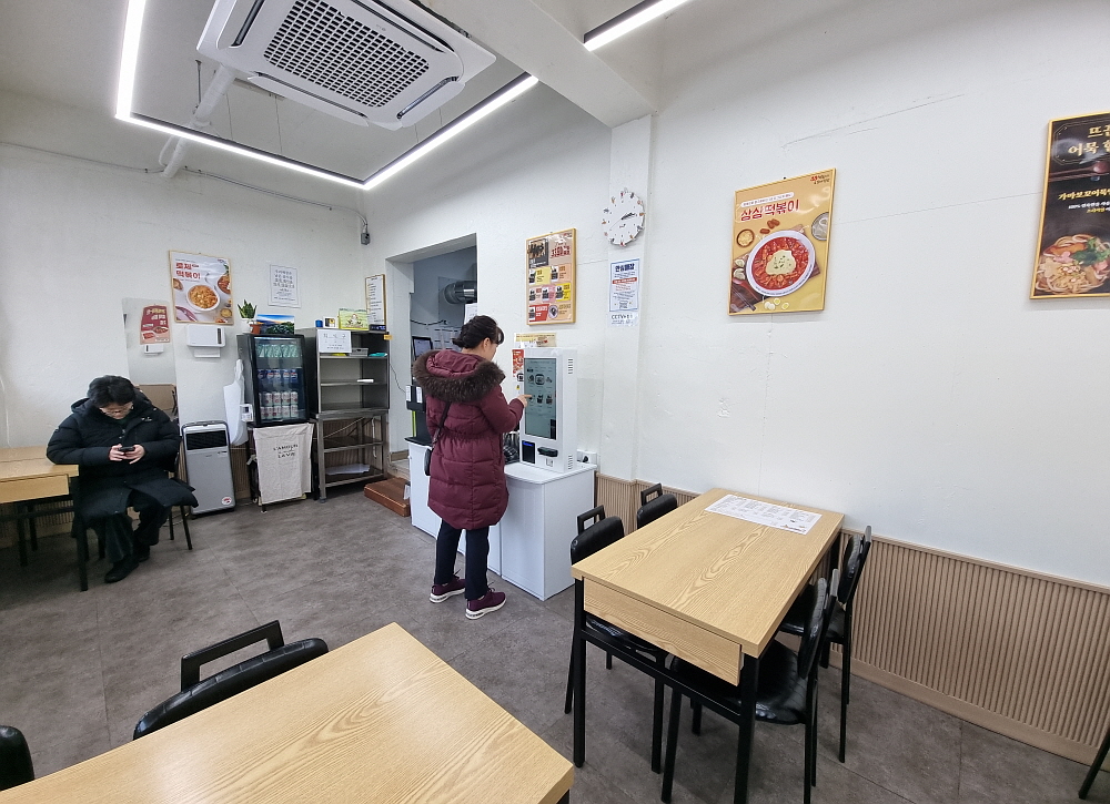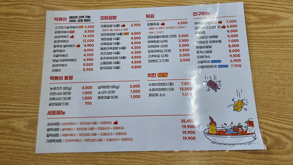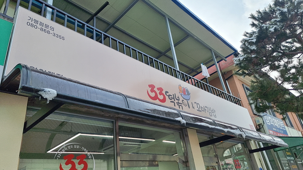 그런데 이상할 정도로 식당이 눈에 띄지 않았다. '여기 사람들은 식당을 잘 가지않나?' 하는 생각이 들 정도였다. 그러다 이집을 발견했다. 너무나 반가웠다. 이름은 33떡볶이와 꼬마김밥이라는 식당이었다. 나중에 보니 이것도 체인점이긴 했는데 처음 보는 브랜드인지라 여기만 있는 식당인줄 알았다. 아무려면 어쩌랴... 일단 요기를 할 수 있게 되었다는 것만으로도 감사할 따름이다. 눈발이 예사롭지 않은 오후였지만 서둘러 차를 세우고 식당으로 들어갔다. 원래 떡볶이를 그닥 좋아하지 않는 것도 있지만 요즘은 너무 달고 맵고 하여 기왕이면 김밥 위주로 먹기로 했다.