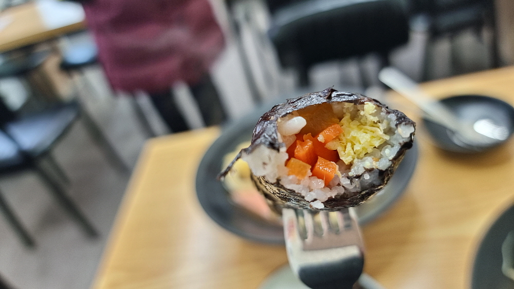요즘은 떡볶이 집이라 하여 특별히 저렴한 느낌은 들지 않는다. 물가도 그렇고, 상황도 그렇다. 꼬마김밥 네 줄과 우동, 쫄면 이렇게 주문한 것이 18,000원 이었다. 이러면 그냥 국밥 한 그릇씩 먹는 것이나 값에서 차이가 없는 듯 하다. 그래도 이게 어디인가? 한가득 내리는 소담스런 눈을 보면서 김밥과 우동을 먹을 수 있다는 것 만으로도 얼마나 감사하고 행복했던지... 이집의 꼬마김밥은 꼬마김밥 계에서는 제법 덩치가 큰 편이라 할 수 있다. 그래서 들어간 내용물도 꽤나 있다. 그냥 단무지 하나 들어간 송우리의 꼬마김밥 집과는 좀 차이가 있다.