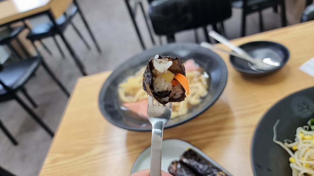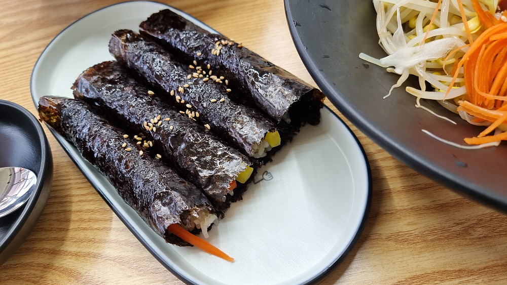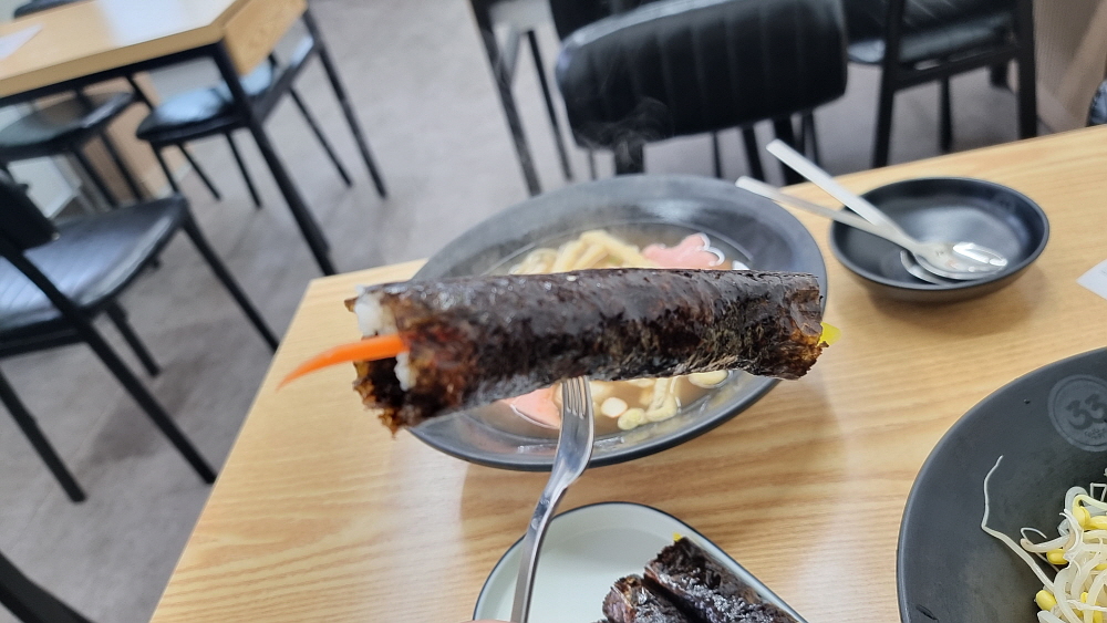 요즘은 떡볶이 집이라 하여 특별히 저렴한 느낌은 들지 않는다. 물가도 그렇고, 상황도 그렇다. 꼬마김밥 네 줄과 우동, 쫄면 이렇게 주문한 것이 18,000원 이었다. 이러면 그냥 국밥 한 그릇씩 먹는 것이나 값에서 차이가 없는 듯 하다. 그래도 이게 어디인가? 한가득 내리는 소담스런 눈을 보면서 김밥과 우동을 먹을 수 있다는 것 만으로도 얼마나 감사하고 행복했던지... 이집의 꼬마김밥은 꼬마김밥 계에서는 제법 덩치가 큰 편이라 할 수 있다. 그래서 들어간 내용물도 꽤나 있다. 그냥 단무지 하나 들어간 송우리의 꼬마김밥 집과는 좀 차이가 있다.