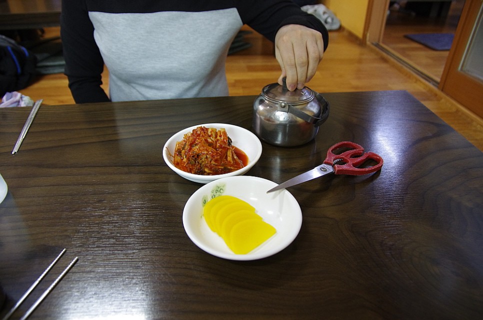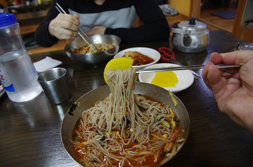 나는 막국수를 먹을 때 거의 늘 육수를 많이 부어 물 막국수로 만드는데 이집은 참기름을 많이 넣어 주었기에 그 국물에 온통 고소한 기름이 둥둥 떠 있다. 그리고 특이하게 내 놓은 단무지를 메밀면과 함께 먹는다. 메밀은 꼭 무와 함께 먹어야 한다. 무가 메밀의 독성을 잡아주고, 식감도 좋게 해주기 때문이다. 중국집이나 분식집에서 늘 보던 단무지를 여기서 만나니 이렇게 면과 함께 싸먹지 않을 수 없었다. 그 맛이 배가 된다. 역시 오랜 세월 해 온 방식에는 다 이유가 있다. 이렇게 먹으니 한결 식감이 살아 난다. 많다고 걱정하던 첨과 달리 다 먹은 다음에도 우린 갈 곳 없는 젖가락을 내려 놓지 못하고 여기 저기 그릇 속을 헤집었다. 뭐 좀 더 없나? 그리고 정신 없이 먹던 시간을 잠시 내려 놓고, 우리가 먹은 막국수에 대한 평가를 해 봤다. 여기도 진정한 고수의 막국수집이 맞네! 담에 또 와야지~