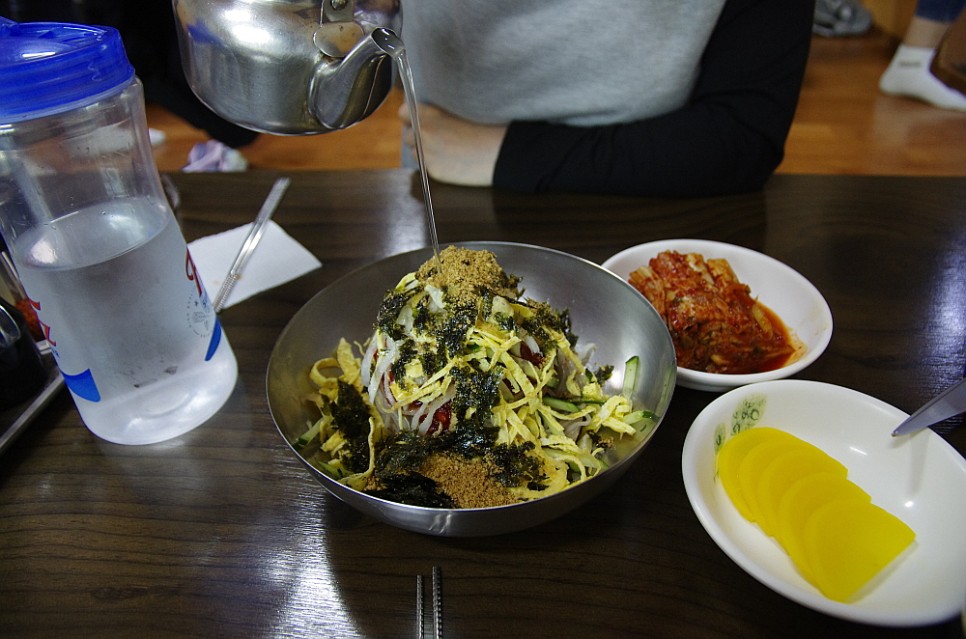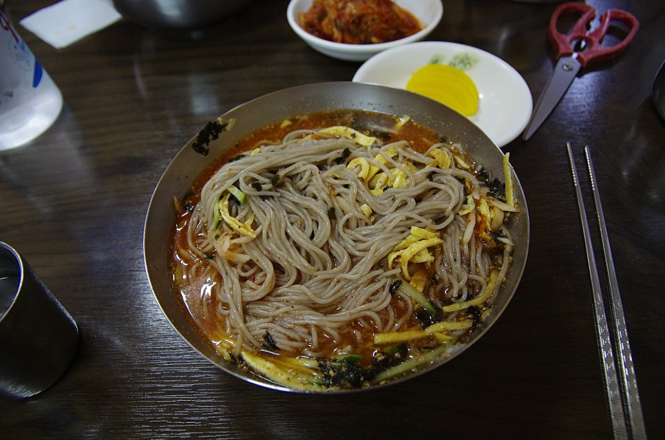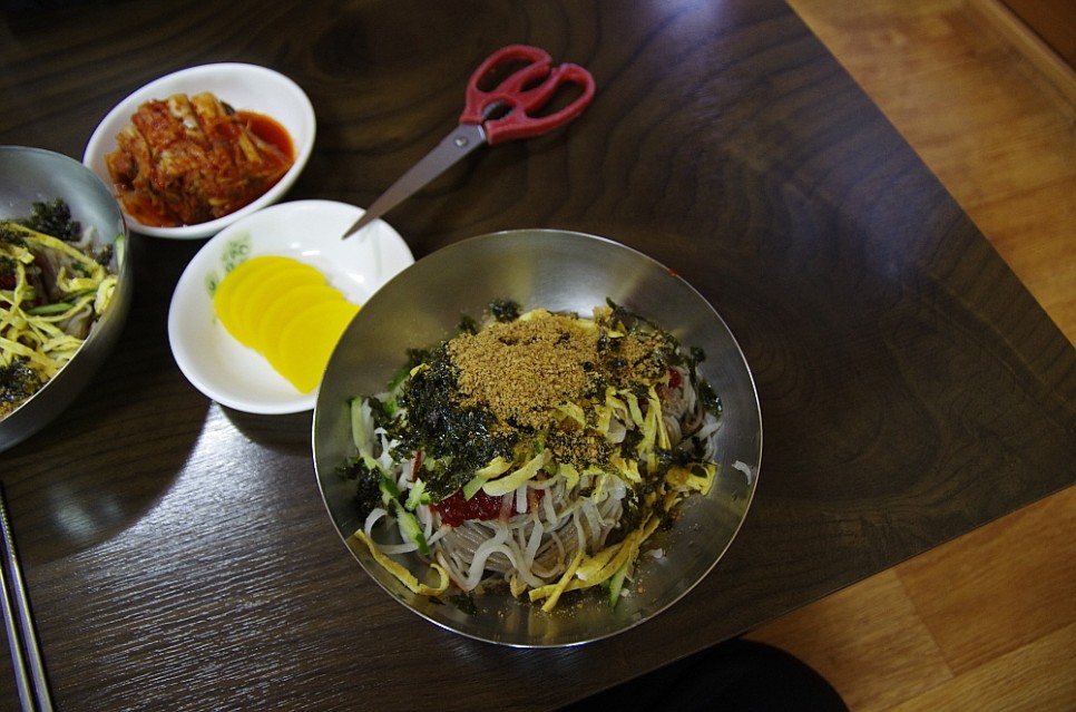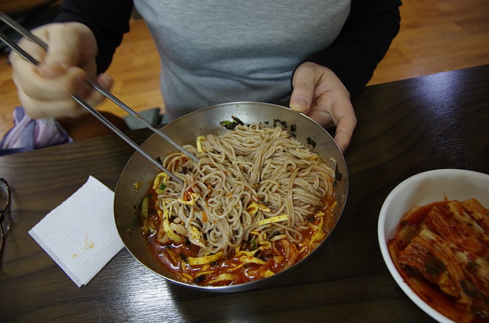 양념을 다 비벼놓고 보니 이거 한 그릇의 양 치고는 너무 많다는 생각이 든다. 인심이 참 후한 곳이다. 우린 아침을 먹은지 얼마 되지 않았는데 이렇게 과하게 인심 좋은 막국수 한 그릇을 놓고 앉으니 난감한 생각마저 있다. 이걸 다 먹을 수 있을까? 조금씩 먹다보니 이런 생각이 얼마나 잘못된 것인지 금새 알게 된다. 막국수의 가장 큰 장점 중에 하나가 소화가 잘 되고, 먹었을 때 속에 부담을 주지 않는다는 것이다. 비록 처음 먹을 땐 양이 엄청 많은 것 같지만 먹고 나서 뒤돌아 서면 벌써 속이 꺼진 느낌을 받는다. 이래서 메밀면이 건강에 좋은 것이다. 적절한 고명과 지루할 틈을 주지 않는 양념은 고급진 메밀면 식사의 또 다른 숨은 주역이다.
