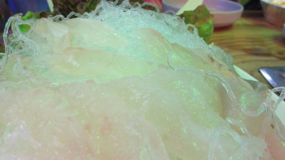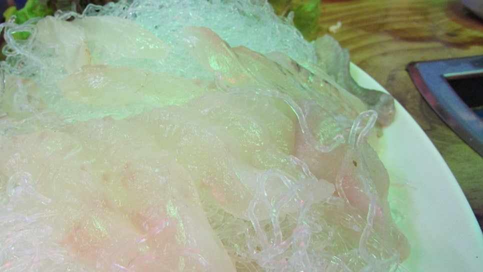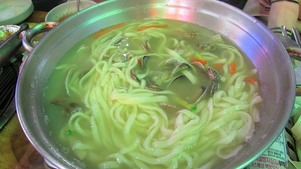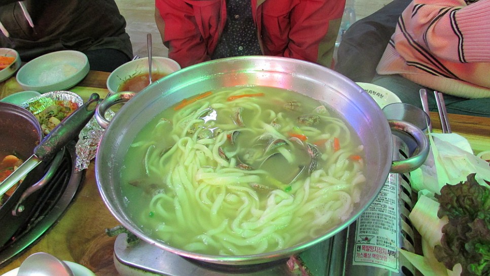뒤를 이어 생선회와 해물탕 그리고 조개국물에 말아 놓은 칼국수도 등장했다. 너무 배가 불러 매운탕은 손도 대지 못하고 말았는데 메뉴들이 나올 때 마다 우리가 이것도 주문했나 하면서 의아할 정도로 음식들이 계속 나왔다. 세트메뉴의 즐거움은 이런 것이 아닐까 싶다. 나는 특히 칼국수가 맘에 들었는데 마눌과 자주가는 바지락 칼국수 집에는 조금 못 미쳤지만 나름의 배틀한 국물맛이 일품이었다. 칼국수는 조금 짜야 제맛이지만 좀 과할 정도로 짠 것이 흠이라면 흠이겠다. 하지만 그래도 마지막을 장식하는 음식으로 이 정도면 만족할만 했다.