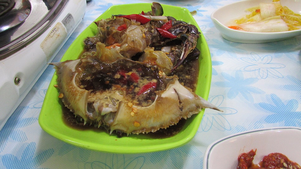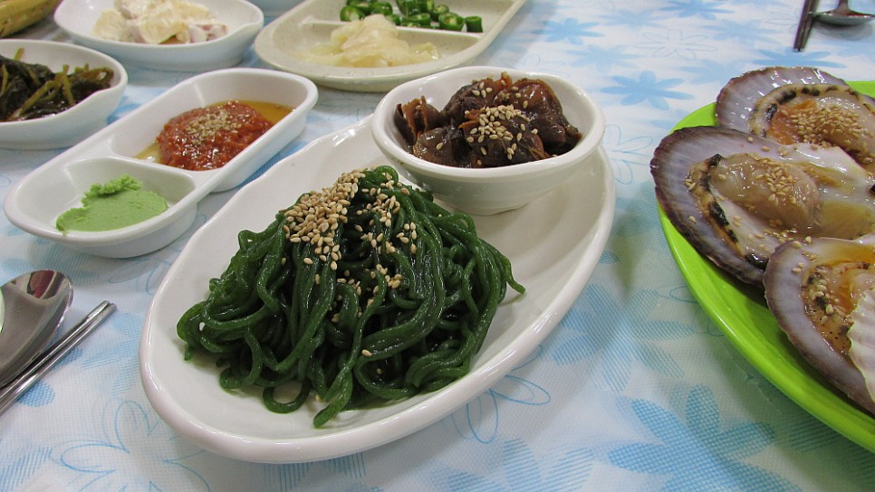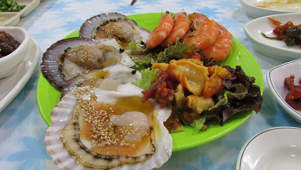 그렇게 앉아서 이런 저런 이야기들을 하고 있는데 해산물로 멍게와 가리비 같은 녀석들이 먼저 나왔다. 이런 해산물이 여기서 나는지는 모르겠지만 어쨌든 물도 신선하고 맛도 괜찮았다. 여자들은 물에 익혀 나온 새우를 무척 좋아라 했는데 남자들은 역시 까먹는 것이 귀찮아서인지 손도 대지 않았다. 그런 것도 남여의 차이라면 차이이겠지... 특이했던 것은 바지락을 간장으로 삶아 내 놓은 것 같은 반찬이었는데 일종의 바지락장이라고 해야할 것 같다. 바지락의 식감은 살아 있으면서 짭조름한 간장 맛이 가미된 훌륭한 밑반찬이었다. 이런 바지락은 나의 경우 처음 먹어보는 것 같다.