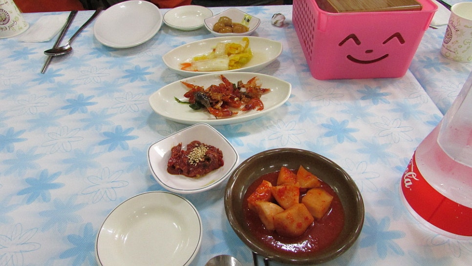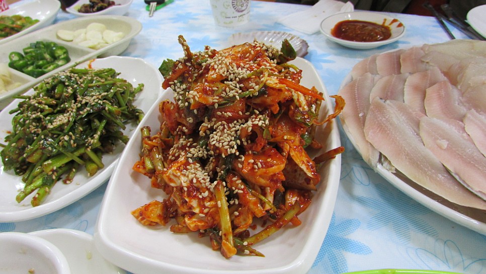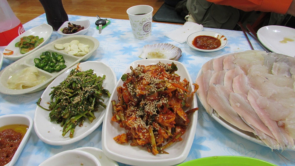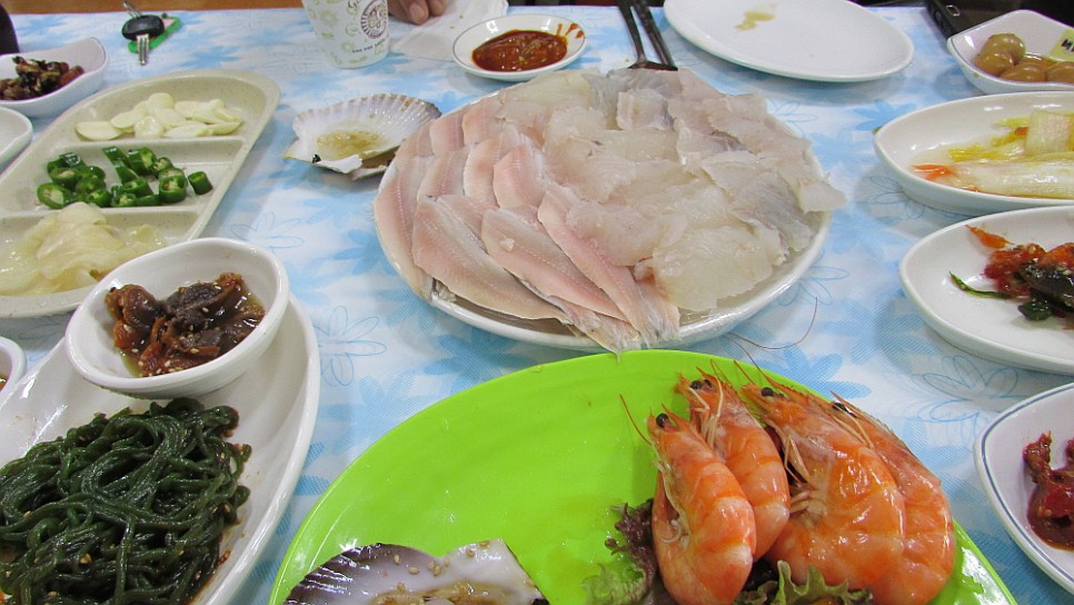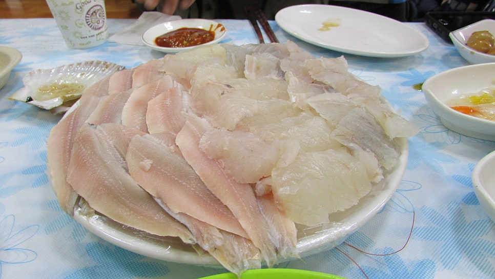 시간이 딱 점심 때라 그런지 식당 안에는 이미 몇 팀의 손님들이 있었다. 그 뒤로도 계속 손님들이 들어오는 것으로 봐서 역시 맛만 좋으면 찾기 어려운 곳에 있어도 사람들은 오게 되어 있구나 싶은 생각이 들었다. 이곳은 횟집이지만 횟감을 얼마에 주문하는 것이 아니라 일인당 얼마 이런식으로 코스 요리를 먹는다. 우리도 그런 코스요리를 주문했는데 이렇게 먹으면 그 때 그 때 제철에 맞는 횟감과 음식들을 구별해서 내 놓는다고 했다.