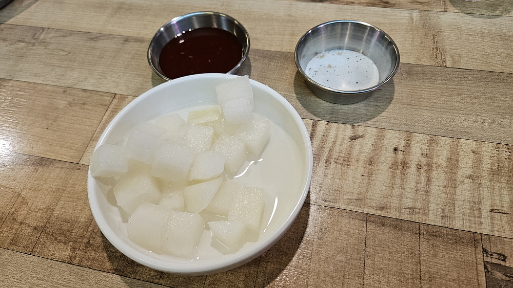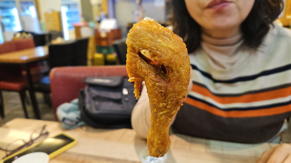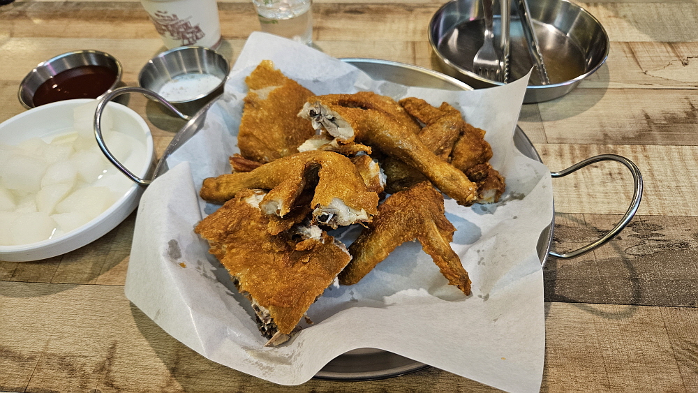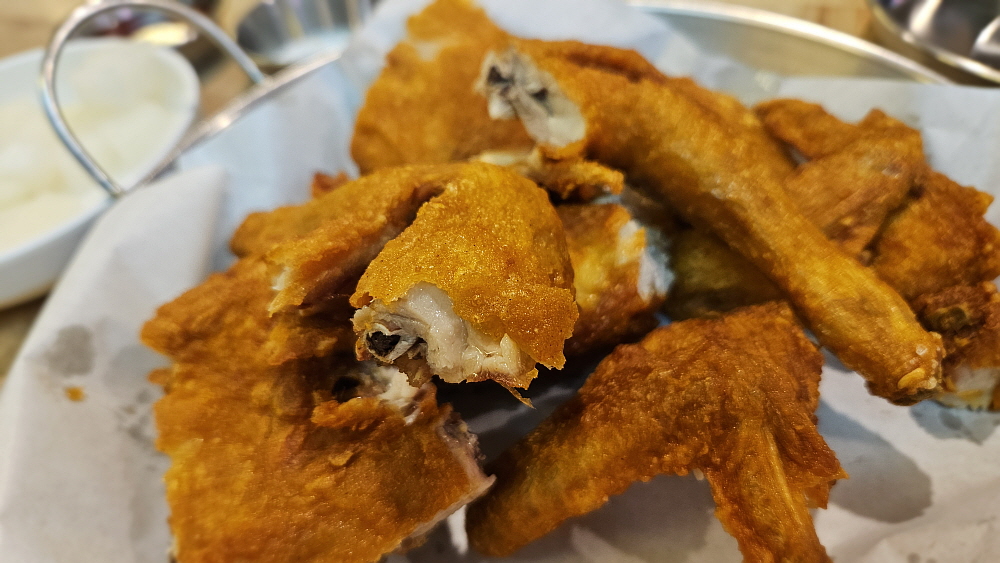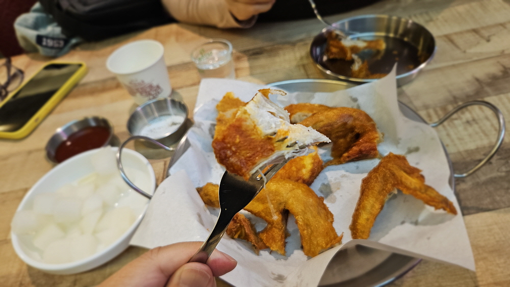 얼마 뒤 치킨이 나왔다. 최근에 이런 비주얼의 치킨을 본적이 없다는 생각이 들 정도로 아주 정통의 치킨이었다. 기름과 온도 조절을 잘해서 기름기가 거의 없이 바삭하게 튀겨진 옛날 장터에서 보았던 바로 그 치킨의 모습이었다. 야~ 하는 감탄사가 절로 나왔다. 요즘도 이렇게 바싹하게 튀겨주는 집이 있구나... 양념이나 다른 조작없이 그냥 염지닭 본연의 맛을 오랫만에 보게 된 것이다. 평소 그닥 좋아하는 편은 아니지만 이렇게 군침을 삼키게 만드는 치킨은 정말 오랫만인 것 같다. 우리는 서둘러 닭을 먹기 시작했다. 누가 먼저랄 것도 없이 그냥 포크와 집게를 들고 사냥하듯 먹었다.