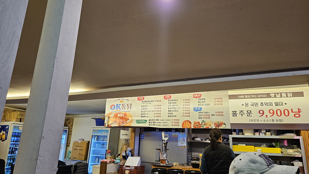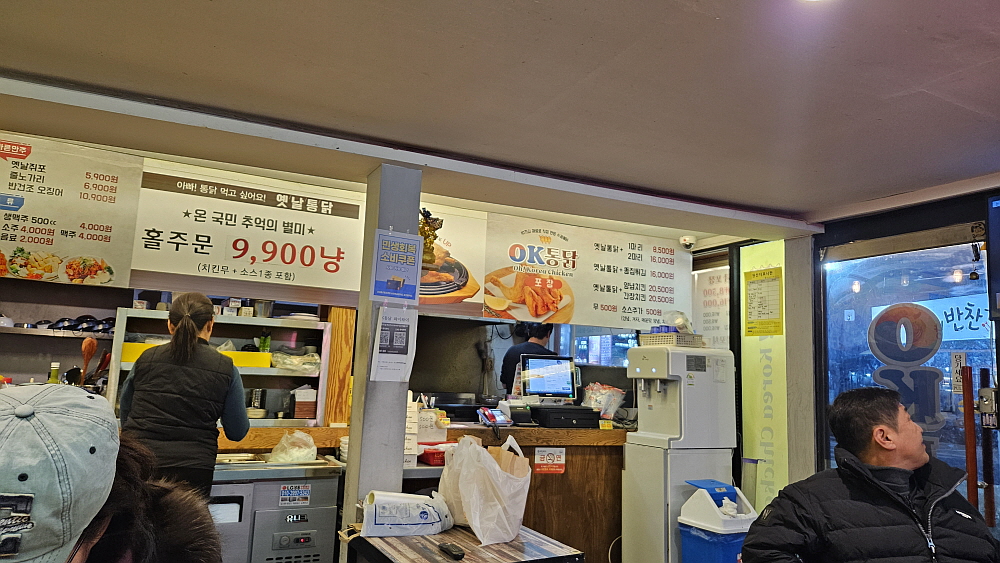 이집의 가성비는 월등히 좋다. 포장일 경우 한 마리에 8,500원이고 홀에서 먹는다 해도 9,900원이면 한 마리를 먹을 수 있다. 이렇게 저렴한 가격의 통닭집인 경우 보통 홀 장사는 신경을 별로 쓰지 않는 법인데 이집은 홀에서 통닭과 술을 마시는 손님들이 꽤나 많았다. 그만큼 홀도 넓고, 깨끗하고, 분위기도 나쁘지 않았다. 우리는 그냥 시그니쳐 통닭을 주문했다. 양념이나 간장양념이나 치즈 또는 버터 치킨 등이 있지만 이날은 그냥 기름에 온전히 튀겨낸 오리지널 통닭이 먹고 싶었다. 거기에 소주 한 잔이면 우리의 저녁으로 그만이다. 포장 손님도 많고, 홀 손님도 많은 장사가 잘 되는 집이란 생각이 들었다.