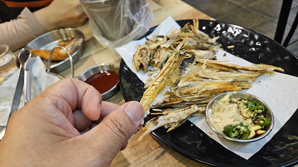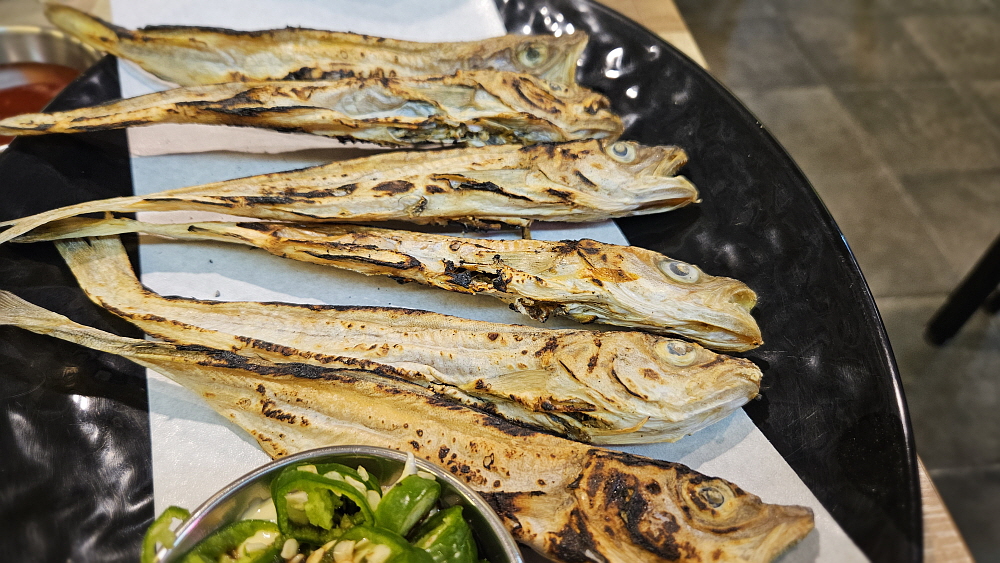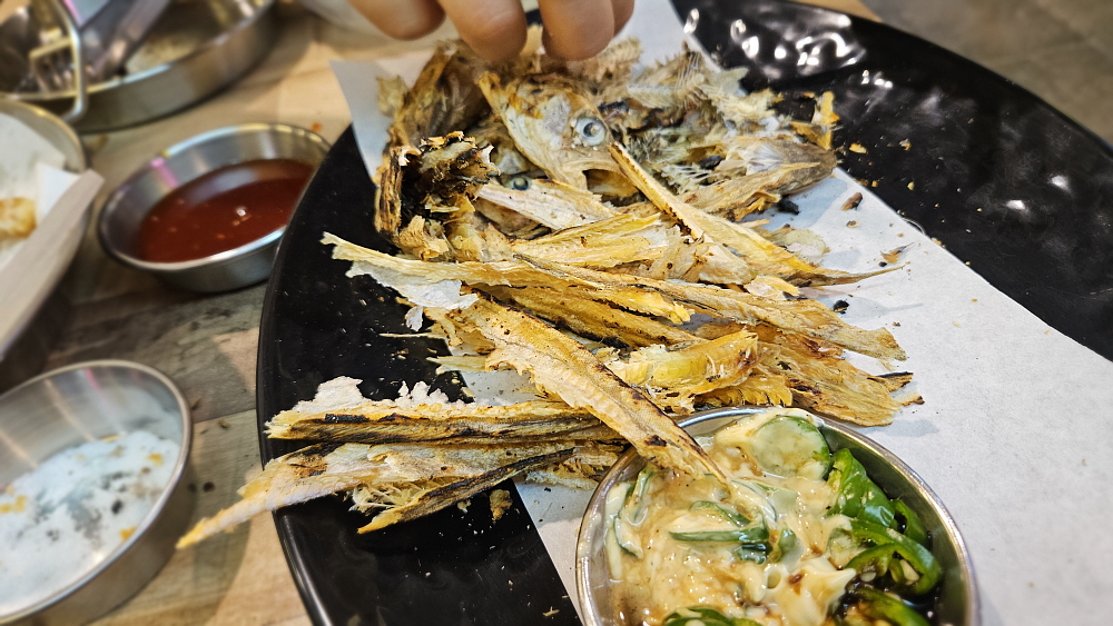 그래도 성인 둘이서 작은 시장통닭 하나로 술과 저녁식사를 모두 해결한다는 것이 좀 부족한 감이 있었다. 그래서 메뉴를 보다 반가운 것을 발견했다. 옛날 풍의 노가리 구이였다. 요즘 노가리는 크기도 예전과 달리 엄청 크고, 조미가 강하게 되어 있어 쥐포를 먹는 느낌인데 사실 노가리는 이빨이 아플 정도로 딱딱하게 말린 생선이었다. 잘 구운 다음에 고추장에 찍어 먹었던 것이 정설이었다. 여긴 먹태를 찍어 먹는 양념을 함께 주었다. 이것도 참 맛이 좋았다. 오랫만에 추억의 노가리를 먹으니 너무 반가웠다. 노가리 안주는 대학시절 단골이었는데 말이다. 가격도 착한 편이다. 이렇게 잘 먹고 나가면서 계산을 하는데 둘이 먹은 것이 30,000원이 안 되더라는 말도 안 되는 가성비...