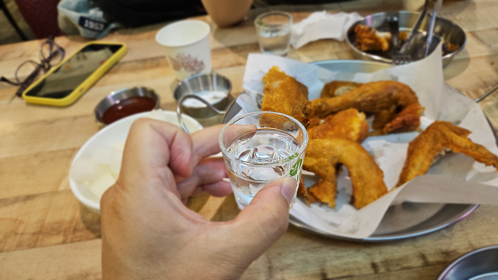 아주 바싹하게 잘 튀겨진 닭은 마치 돼지나 소갈비처럼 살이 찢어진다. 여기서 그런 모양을 다시 보았다. 살 속 깊이 잘 익도록 칼집을 큼직하게 내준 것이 보였다. 온도를 잘 맞춘 덕분에 닭 본연의 맛은 잘 나지만 기름진 느낌은 거의 없었다. 나중에 집에 와서 냄새를 맡아 보았지만 옷에도 그닥 많이 기름냄새가 배지 않았다. 보통 후라이드 통닭을 먹고 집에 가면 그 겉옷은 빨아야 할 정도로 기름 냄새가 배기 마련인데 말이다. 그야말로 정통의 맛을 솜씨좋은 주인장이 잘 만들어 낸 것이다. 소주가 잘 넘어갔다. 원래 통닭은 맥주가 아니라 소주랑 먹어야 제맛이다. 어릴적에 어른들이 이런 식으로 먹는 모습을 종종 봤었다.