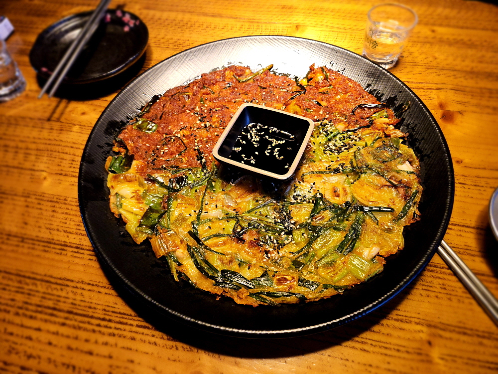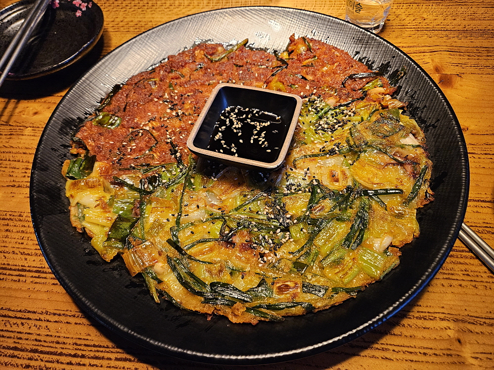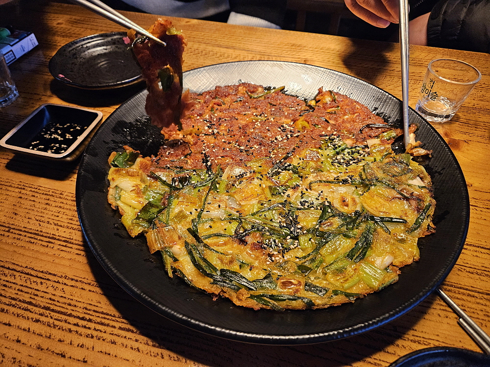 주점이다 보니 안주의 가격이 아무래도 식당보다는 센편이다. 우리는 반반전이라는 것을 주문했는데 파전과 김치전을 반씩 넣은 전이다. 기름에 푹 담근 것처럼 기름맛이 물씬나는 전이라 하겠다. 파전은 의외로 소주와 잘 어울린다. 막걸리와만 잘 맞는 안주가 아니다. 적당한 기름기는 소주의 시원한 맛과 궁합이 맞는다고 하겠다. 약간 게슴치레한 가게 분위기와 잘 어울리는 반반전에 소주를 마셨다. 뭔 할 이야기들이 그리 많은지 모두들 대화 삼매경에 빠졌다. 여기서 아는 사람도 만났다. 그래서인지 여긴 약간 동네 사랑방 같다는 느낌도 들었다.