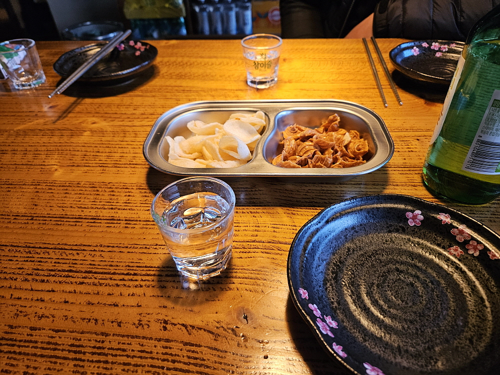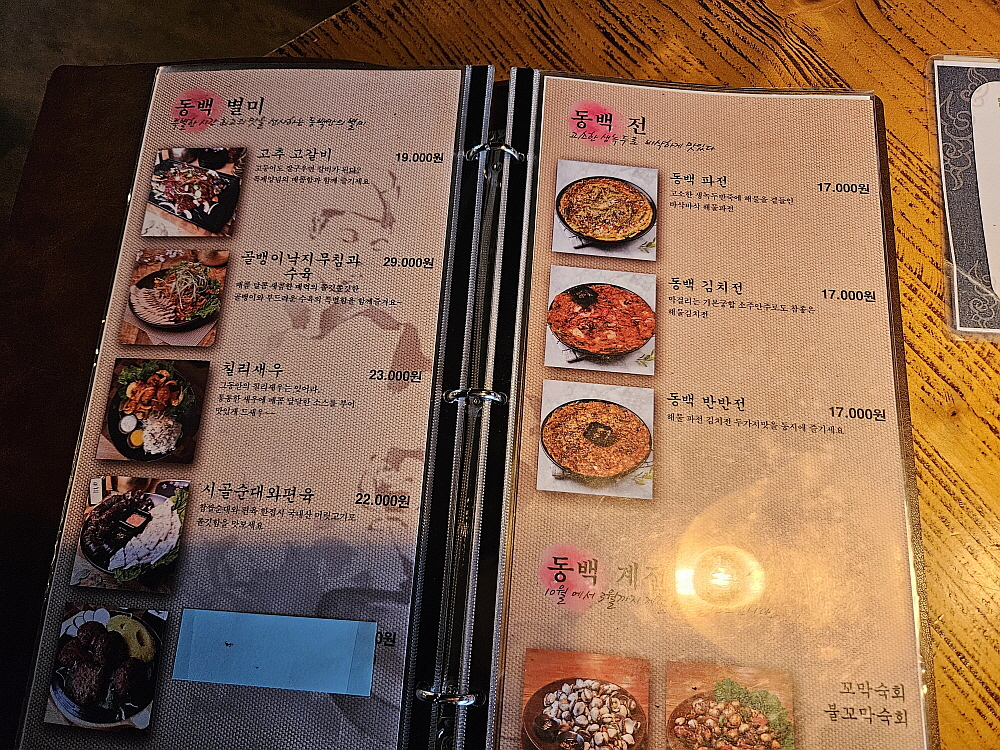 실내의 분위기도 밖과 크게 다르지 않다. 예전 분위기를 불러오는 포스터가 붙어 있고, 자리도 나무로 만든 다소 투박한 것이다. 생각보다 가게안은 큰 편이었다. 비교적 이른 시간인데도 손님들이 있었다. 원래 동백연화라는 주점이 젊은층을 겨냥한 집이라던데 포천이라는 지역 상황이 그래서인지 여기를 이용하는 사람들은 대부분 아재와 아줌들이다. 사실 젊은층보다 우리가 더 잘 어울린다. 들어올 때부터 파전을 먹고 싶었다. 학사주점 분위기라면 파전과 막걸리를 마셔야 하지만 컨디션이 그런 관계로 그냥 소주로 가기로 했다.