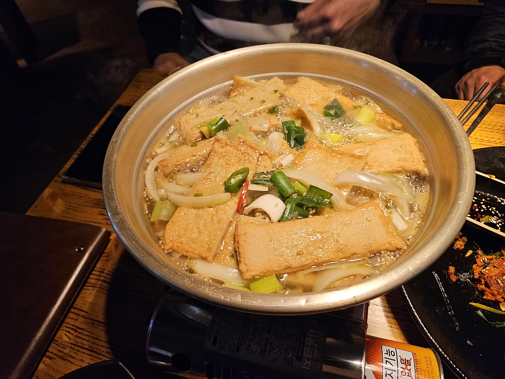 하지만 전을 안주로 하면 약간 문제가 있다. 전이 점점 식는다는 것이다. 처음 나왔을 때는 따끈하고 포실한 식감이 좋지만 오랜 시간 앉아 먹다보면 필연적으로 식은 전이 된다. 이런 문제를 상쇄시키려면 뭔가 따뜻하고 얼큰한 국물이 필요할 것이다. 그래서 주문한 것이 주점의 시그니쳐 안주라 할 수 있는 오뎅탕이다. 맑은 오뎅탕이라 적혀 있는데 청양고추를 많이 넣어 달라고 했다. 주어진 상황에서 최대한 얼큰한 맛을 찾고자 했던 것이다. 물론 맵질인 사람은 잘 먹지 못할 정도로 청양고추를 많이 넣는 바람에 조금 힘들기는 했다.