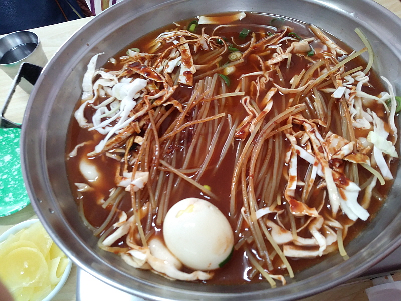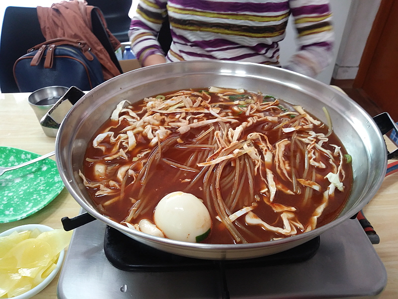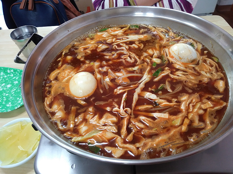 처음 접한 이집의 즉석 떡볶이는 엄청 물이 많은 것이었다. 그리고 춘장을 넣기는 한 것 같은데 우리의 추억속 그집처럼 많은 양을 넣지는 않았다. 그러니까 여기는 손님상 위에서 모든 요리가 되는 시스템이었다. 주방에서는 그저 육수와 떡 등을 넣어 거의 주문과 동시에 냄비를 들고 나왔다. 끓기를 기다리는 5분 정도의 시간이 어찌나 길던지...허기진 시간이기도 했지만 추억 속의 맛일지 궁금해서 그 시간이 정말 영겁의 시간처럼 느껴졌다. 급한 마음에 일단 조금 끓기 시작하자 우린 서둘러 계란부터 집어 들었다.