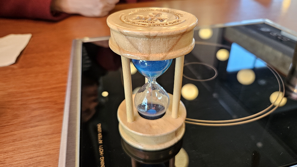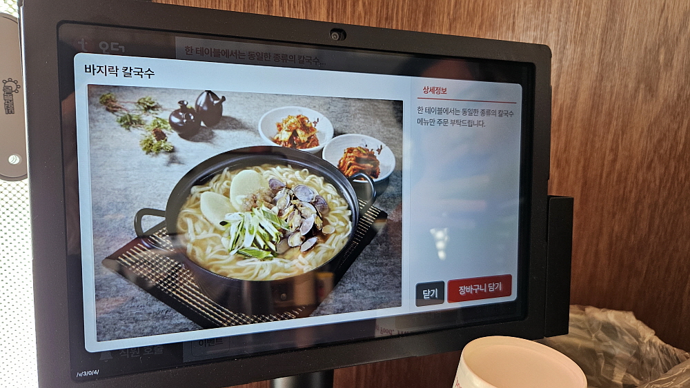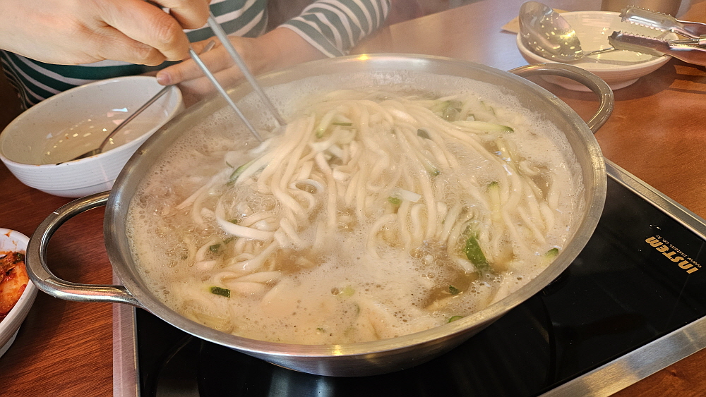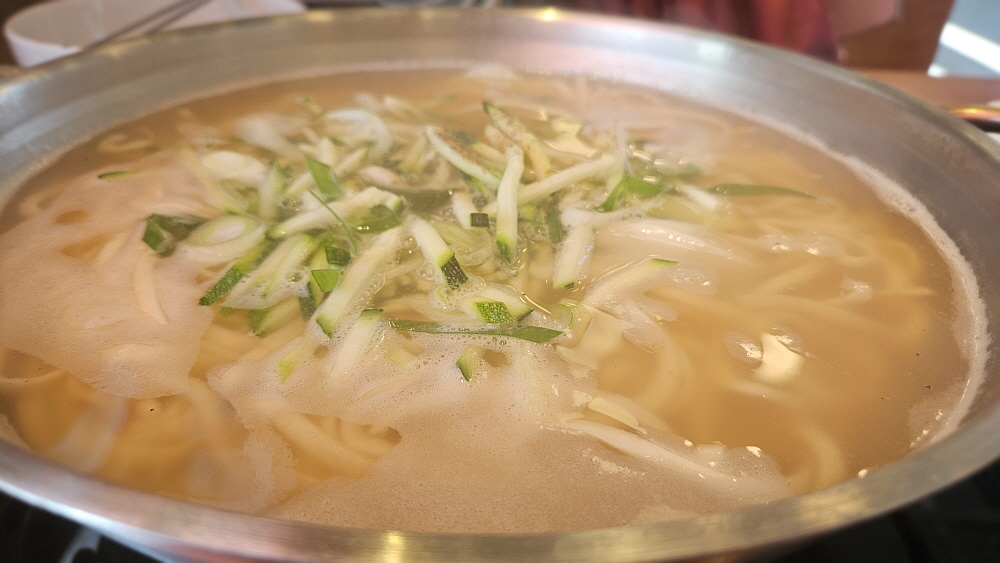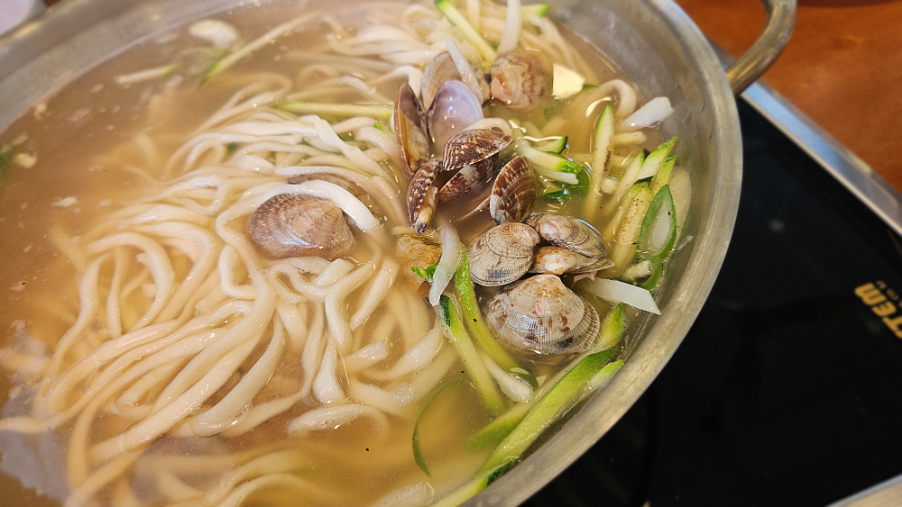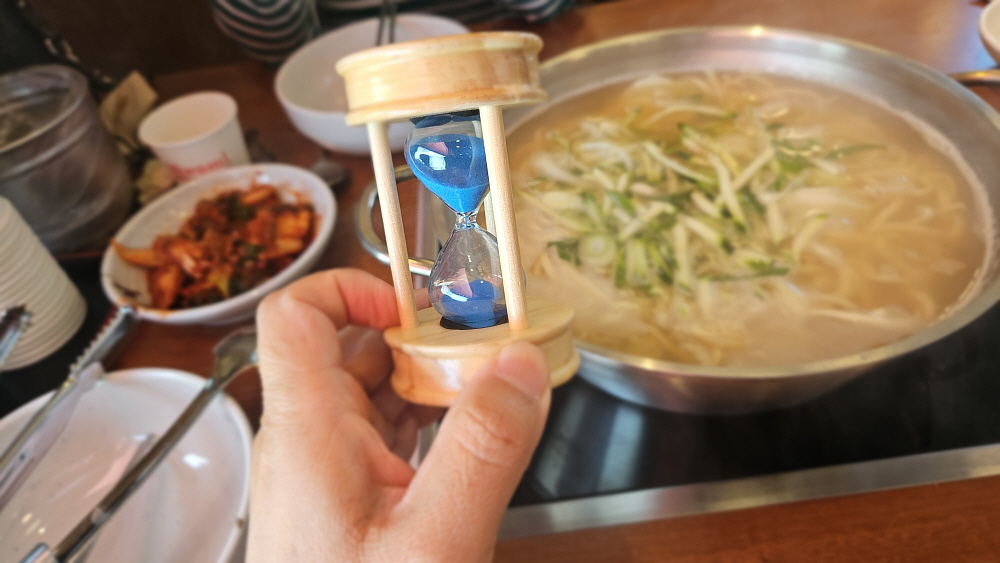 오랜 공사기간을 거쳐 만들어진 집답게 실내는 엄청 깔끔하고 규모도 컸다. 이 정도 크기의 식당을 오픈하려면 비용이 엄청 들었을 것이다. 여기는 칼국수 집이지만, 손님 테이블에 불판이 있어 80%정도 조리된 칼국수 냄비를 다시 손님들이 3분 정도 더 끓이는 방식이다. 그래서 테이블 마다 모래시계가 있다. 우리는 최애 아이템인 바지락 칼국수를 주문했다. 일인분의 가격은 11,000원이다. 이 정도 가격이면 합리적인 수준이라 할 수 있다. 저렴한 편은 아니지만 말이다. 오픈한지 얼마 되지 않아서인지 식당 안은 손님들로 문전성시를 이루고 있었다. 역시 한국 사람들이 칼국수를 참 좋아한다.