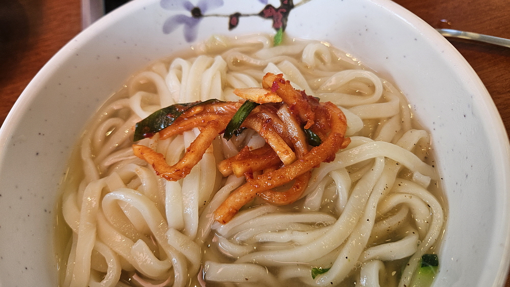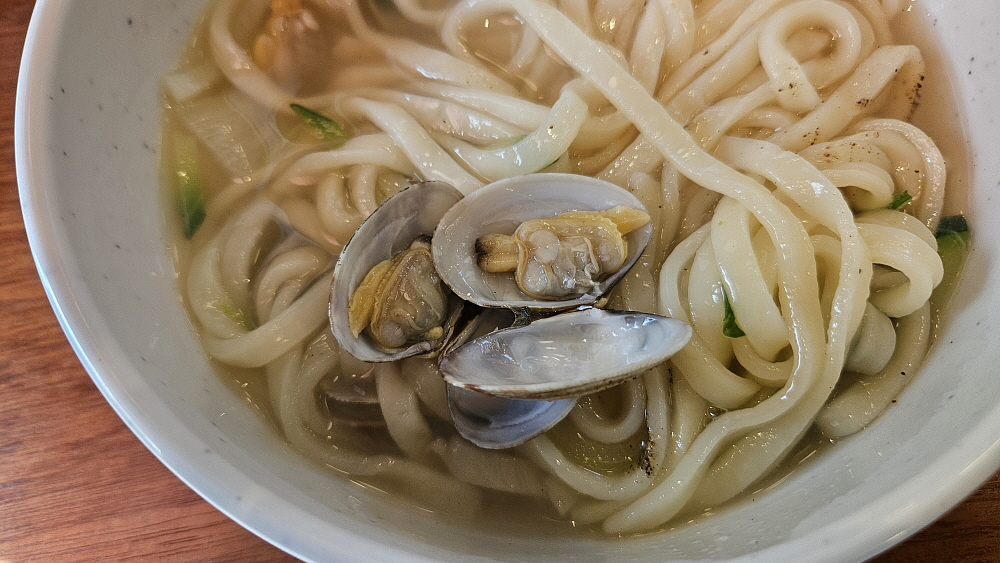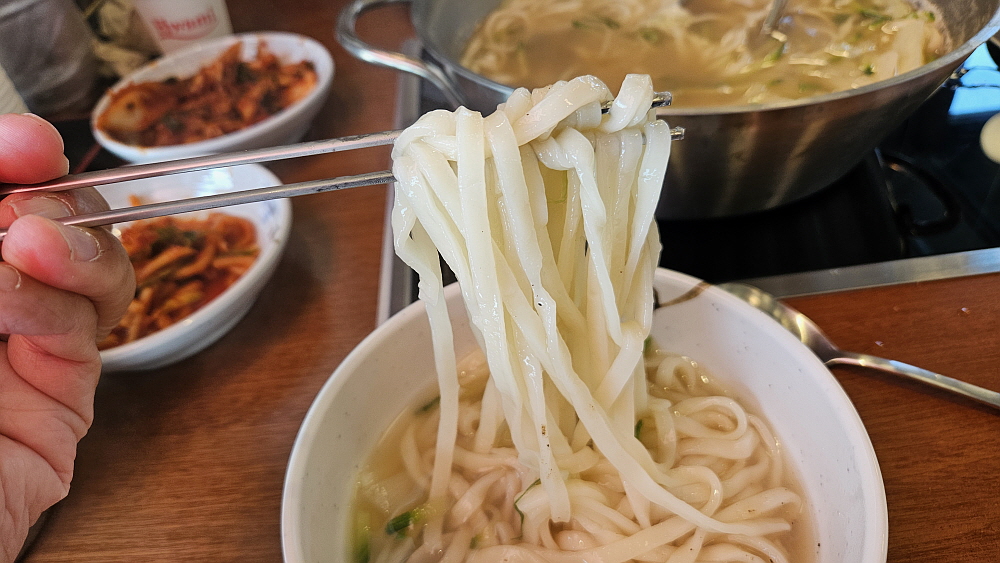 개업기념이라도 절편 떡도 주었다. 그리고 여기서 참 좋았던 것 중 하나가 바로 무채나물이었다. 시원하고, 알싸하고, 약간 매콤한 것이 정말 맛이 좋았다. 칼국수와는 찰떡궁합이다. 반찬은 손님들이 리필하는 방식이라 부담이 없었다. 그렇게 3분 정도 더 기다리니 드디어 칼국수의 생면이 다 익었다. 이집의 홍보문구를 보면 칼국수 귀신이 만든 칼국수라는 말이 있는데 과연 맛이 어떨지 궁금했다. 바지락 조개가 아주 많은 것은 아니지만 이상할 정도로 국물에서는 바지락 향이 진하게 났다. 분명 다른 무엇인가를 더 넣은 것 같다. 칼국수의 면발은 부드러운 편이다.