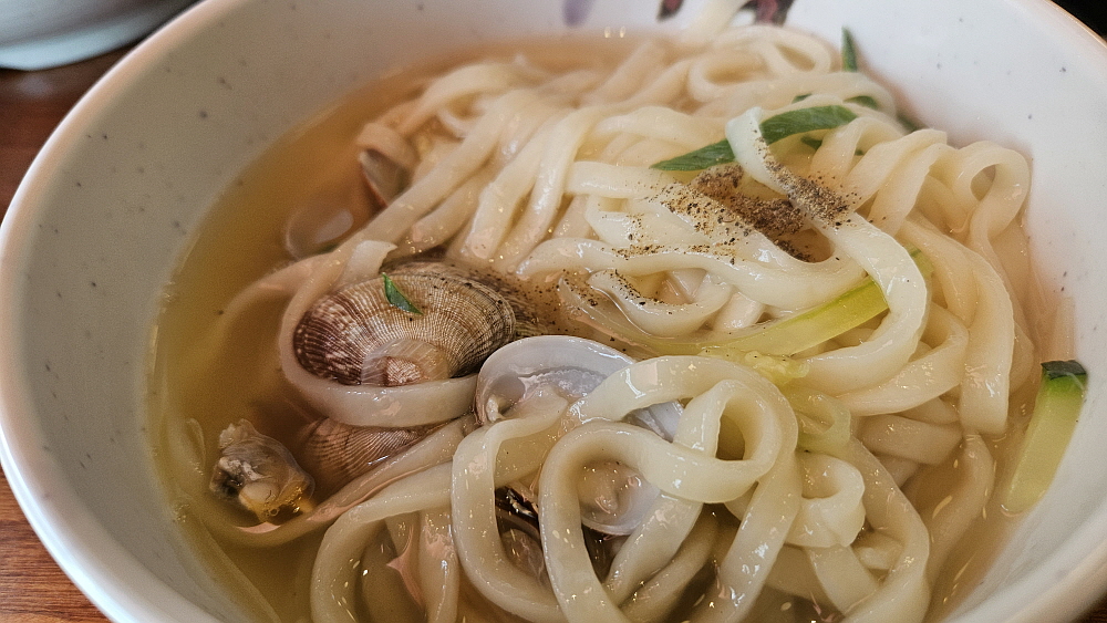 개업기념이라도 절편 떡도 주었다. 그리고 여기서 참 좋았던 것 중 하나가 바로 무채나물이었다. 시원하고, 알싸하고, 약간 매콤한 것이 정말 맛이 좋았다. 칼국수와는 찰떡궁합이다. 반찬은 손님들이 리필하는 방식이라 부담이 없었다. 그렇게 3분 정도 더 기다리니 드디어 칼국수의 생면이 다 익었다. 이집의 홍보문구를 보면 칼국수 귀신이 만든 칼국수라는 말이 있는데 과연 맛이 어떨지 궁금했다. 바지락 조개가 아주 많은 것은 아니지만 이상할 정도로 국물에서는 바지락 향이 진하게 났다. 분명 다른 무엇인가를 더 넣은 것 같다. 칼국수의 면발은 부드러운 편이다.