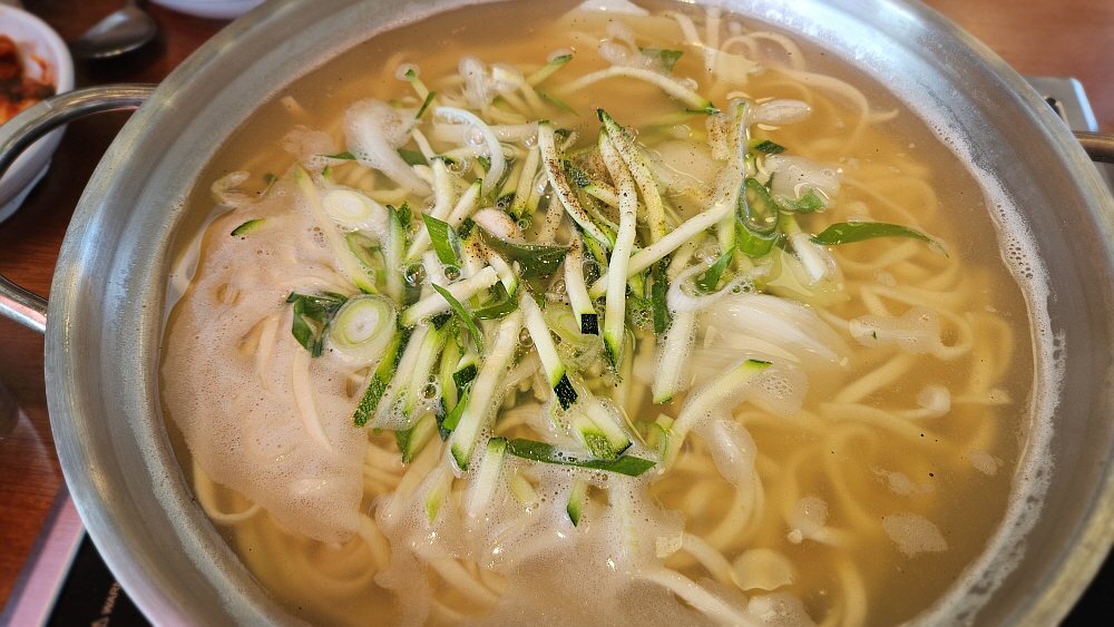 오랜 공사기간을 거쳐 만들어진 집답게 실내는 엄청 깔끔하고 규모도 컸다. 이 정도 크기의 식당을 오픈하려면 비용이 엄청 들었을 것이다. 여기는 칼국수 집이지만, 손님 테이블에 불판이 있어 80%정도 조리된 칼국수 냄비를 다시 손님들이 3분 정도 더 끓이는 방식이다. 그래서 테이블 마다 모래시계가 있다. 우리는 최애 아이템인 바지락 칼국수를 주문했다. 일인분의 가격은 11,000원이다. 이 정도 가격이면 합리적인 수준이라 할 수 있다. 저렴한 편은 아니지만 말이다. 오픈한지 얼마 되지 않아서인지 식당 안은 손님들로 문전성시를 이루고 있었다. 역시 한국 사람들이 칼국수를 참 좋아한다.