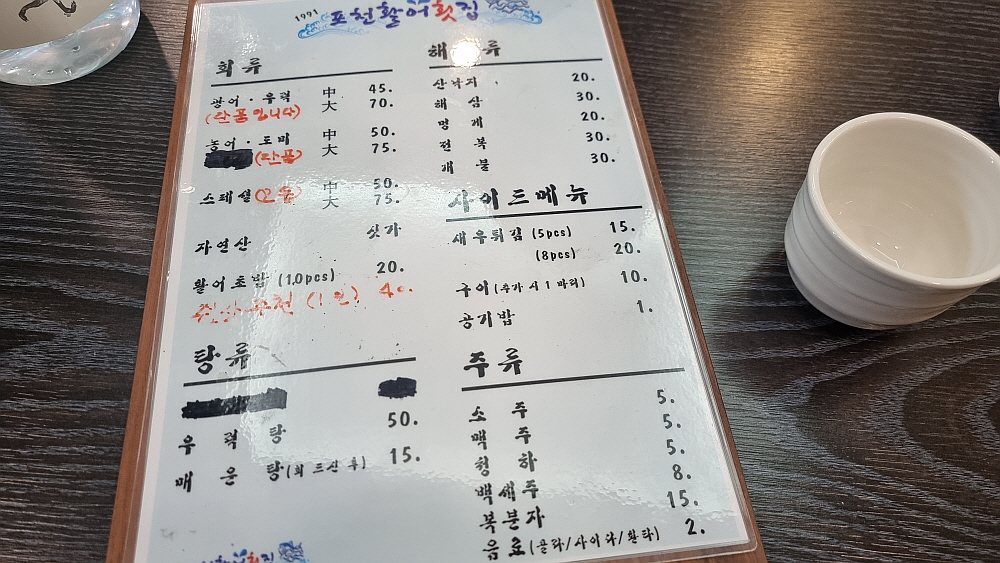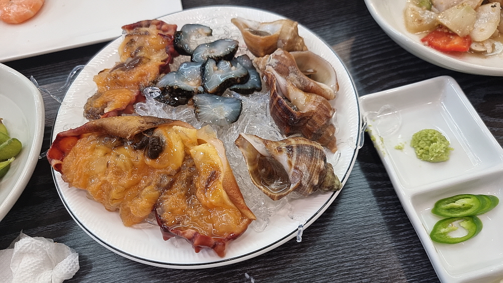가격이 저렴해도 나올 것은 다 나온다. 스끼다시 불리는 반찬들이 계속 나왔다. 특히 신선한 멍게는 압권이었다. 그리고 오랫만에 싱싱한 해삼도 먹었다. 이거 한 접시만으로도 2만 원을 받아도 될 것 같았다. 홍합탕과 삶은 새우, 계란찜과 샐러드까지 참 푸짐했다. 혹 이런 메뉴판의 가격이 잘못된 것 아닐까 싶은 생각이 들 정도로 호사를 누리는 반찬들이었다. 하지만 잘못된 구성이 아니다. 옆 테이블을 보니 거기도 비슷한 구성이었다. 정말 착한 가격의 구성이다. 나중에 매운탕을 먹을 때 따로 값을 지불한다 해도 이 정도면 너무나 훌륭한 가성비이다.