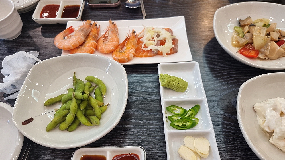 가격이 저렴해도 나올 것은 다 나온다. 스끼다시 불리는 반찬들이 계속 나왔다. 특히 신선한 멍게는 압권이었다. 그리고 오랫만에 싱싱한 해삼도 먹었다. 이거 한 접시만으로도 2만 원을 받아도 될 것 같았다. 홍합탕과 삶은 새우, 계란찜과 샐러드까지 참 푸짐했다. 혹 이런 메뉴판의 가격이 잘못된 것 아닐까 싶은 생각이 들 정도로 호사를 누리는 반찬들이었다. 하지만 잘못된 구성이 아니다. 옆 테이블을 보니 거기도 비슷한 구성이었다. 정말 착한 가격의 구성이다. 나중에 매운탕을 먹을 때 따로 값을 지불한다 해도 이 정도면 너무나 훌륭한 가성비이다.
