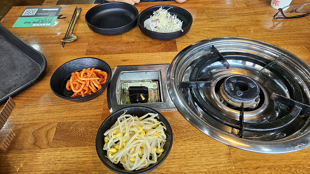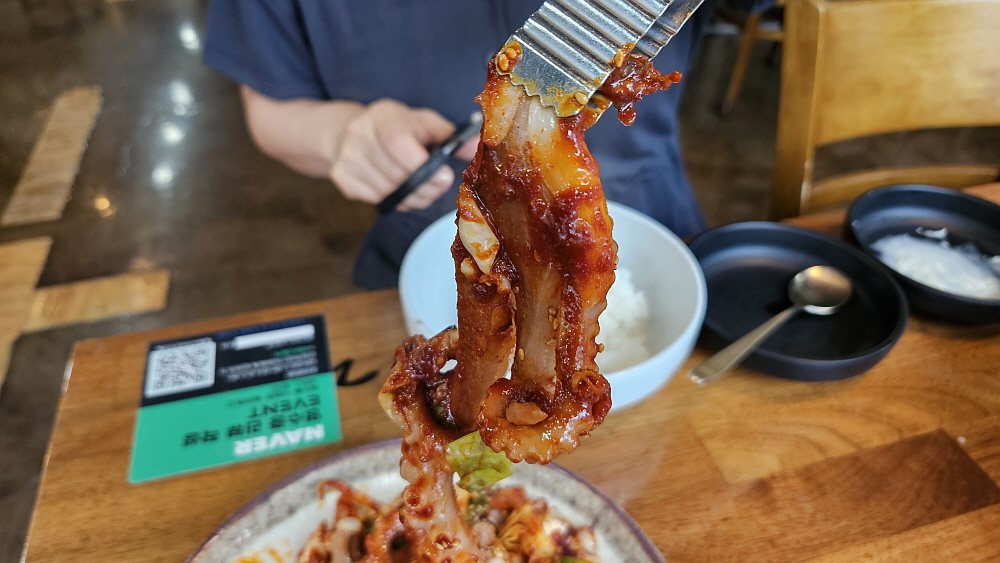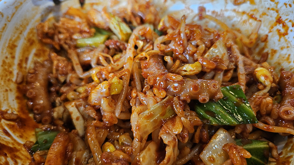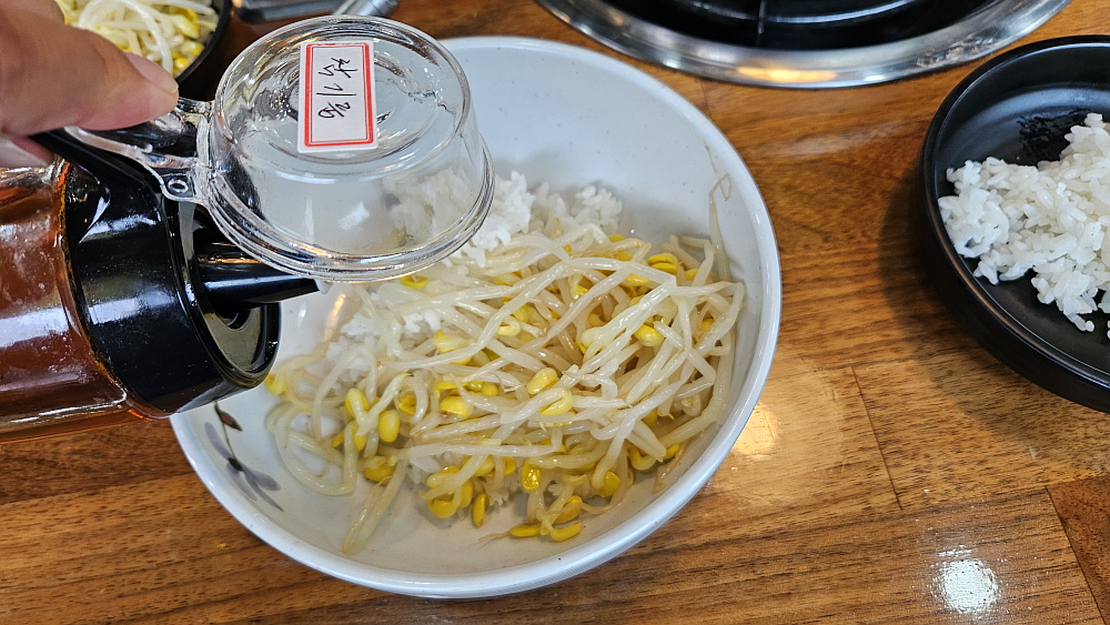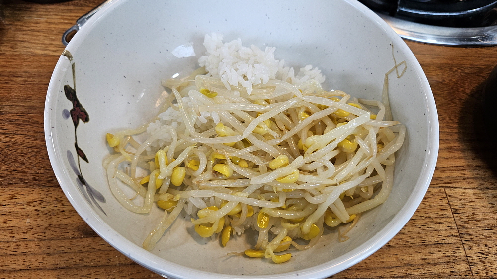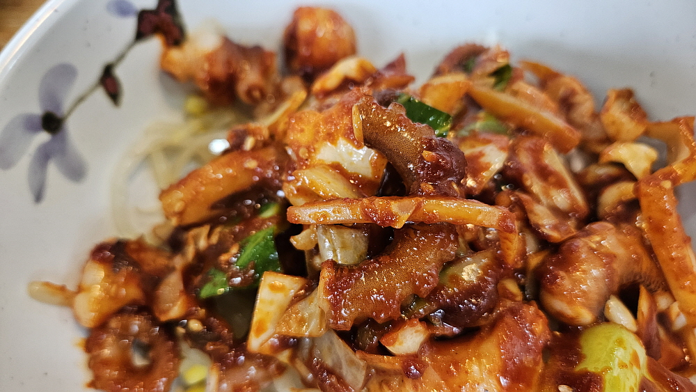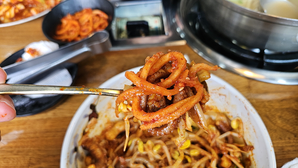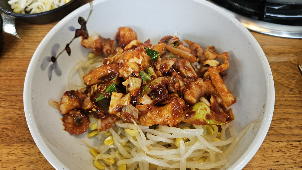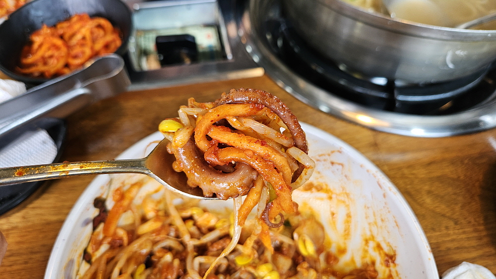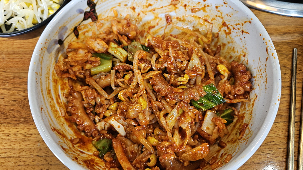 대부분 낙지볶음집들은 레시피가 비슷하다. 철판에 직접 구워먹는 방식이 아니라면 말이다. 매콤한 낙지볶음과 밥, 콩나물무침과 무생채 같은 것을 넣고 참기름을 뿌려 비벼 먹는 것이 거의 대부분의 경우이다. 여기도 예외는 아니었다. 다소 통통한 콩나물을 맵질들을 위한 배려 차원의 안전장치라 하겠다. 식감도 좋다. 양배추와 함께 잘 볶은 낙지는 그냥 먹어도 맛나고, 밥과 비벼먹어도 맛이 끝내준다. 이마에 살짝 땀이 맺힐 정도의 맵기라 말 그대로 기분좋게, 맛있게 매운 정도라 하겠다. 세프코너에서 콩나물과 반찬은 계속 가져다 먹을 수 있고, 밥 먹은 뒤의 후식같은 숭늉도 있었다.