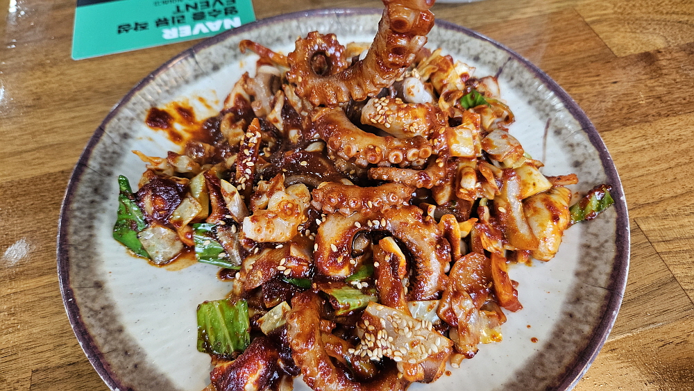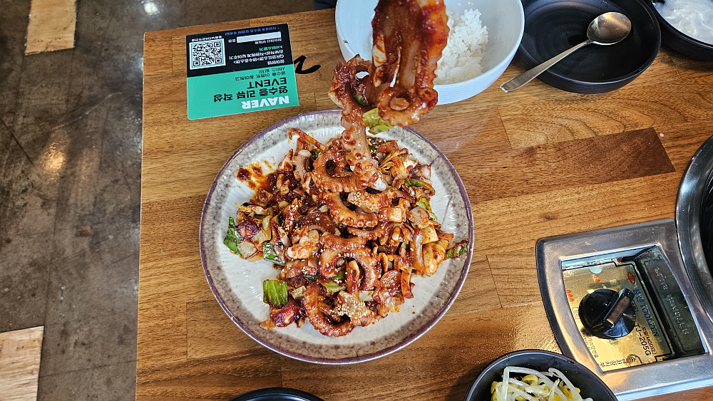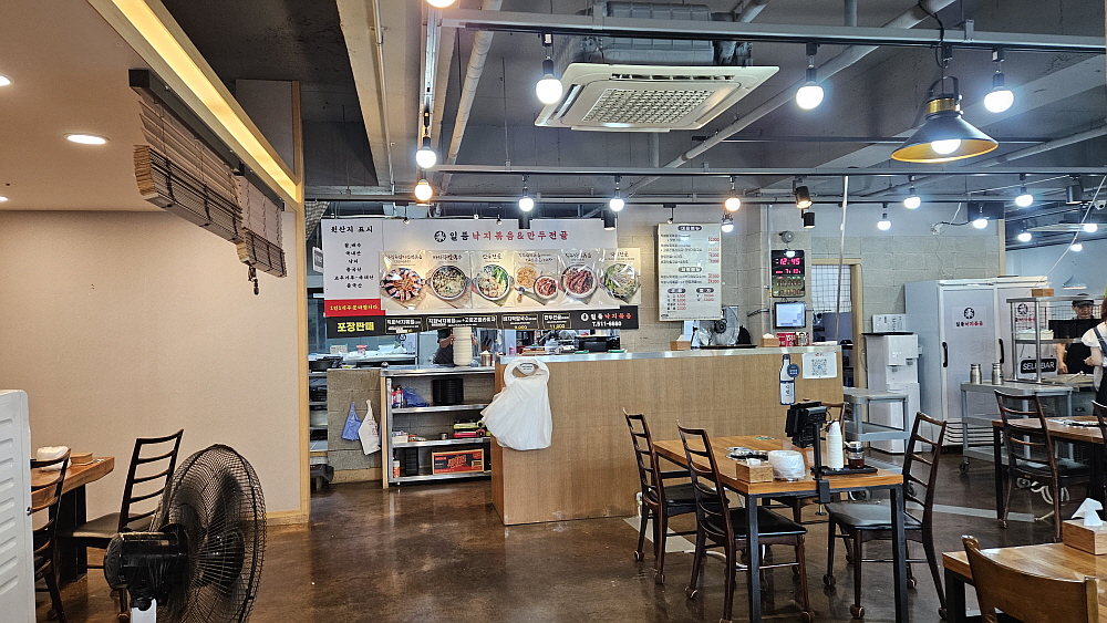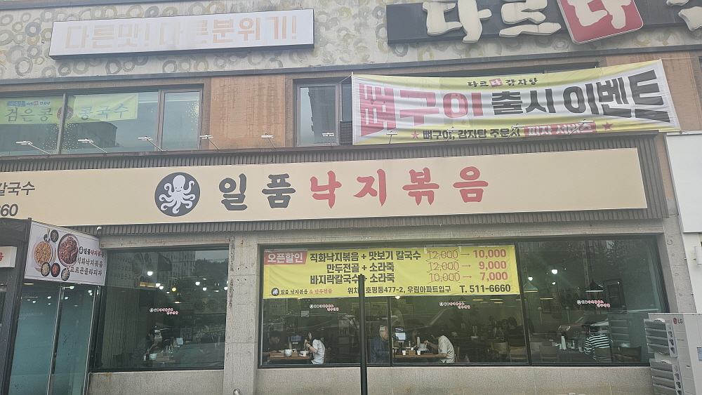 어디가 어디인지 구분도 잘 하기 힘들 정도로 복잡해진 이곳에서 점심을 먹게 되었다. 이마트 부근에 먹자골목이 형성된 것은 봤지만 주차하기가 어려워 내려오면서 봐 두었던 이집으로 향했다. 이곳의 이름은 '일품낙지볶음'이다. 간판에 직관적으로 써 있듯 여긴 낙지볶음을 파는 집이다. 낙지요리가 크게 볶음과 연포탕으로 나뉜다고 볼 때 개인적으로 볶음을 엄청 선호한다. 맵질이지만 이상하게도 쭈꾸미나 낙지의 매운 볶음요리는 자주 끌린다. 낙지나 오징어, 쭈꾸미는 모두 조금은 매콤한 양념에 볶아야 제 맛이 나는 것 같다. 아마 그런것이 음식에서의 궁합이라고 해야겠지...