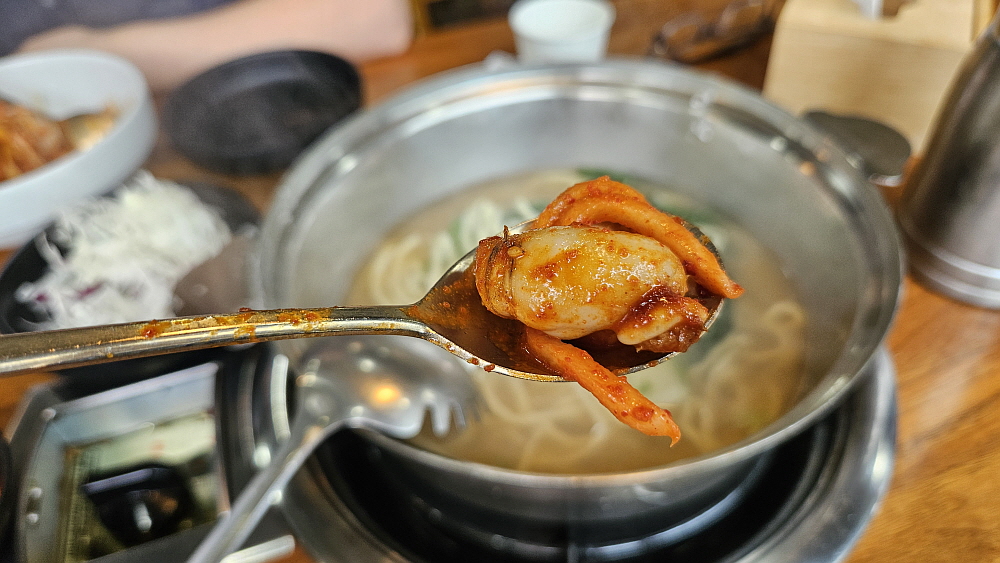 맛보기 칼국수도 훌륭했다. 칼국수 전문집처럼 아주 깊은 맛이라 하긴 뭐해도 그냥 먹기엔 전혀 부족함이 없는 무난한 맛이었다. 매콤한 낙지볶음과 시원하면서 뜨끈한 칼국수는 의외로 궁합이 잘 맞는다. 하긴 이런 매콤한 음식엔 국물이 필요하기는 하다. 잘 익은 낙지는 사실 이렇게 밥과 함께 그냥 후루룩 먹기엔 좀 아까운 감이 있다. 술 한 잔이라도 걸쳐야 예의인데 이날은 어쩔 수 없었다. 이렇게 맛나게 매운 반찬을 밥에 비벼 먹으면 아무래도 평소보다 밥 양을 더 먹게 된다. 과식을 부르는 안타까운 집이지만 그 맛에 취해 어쩔 수 없이 계속 숟가락질을 하게 되는 묘한 곳이기도 하다.