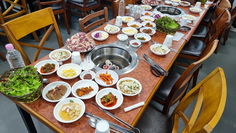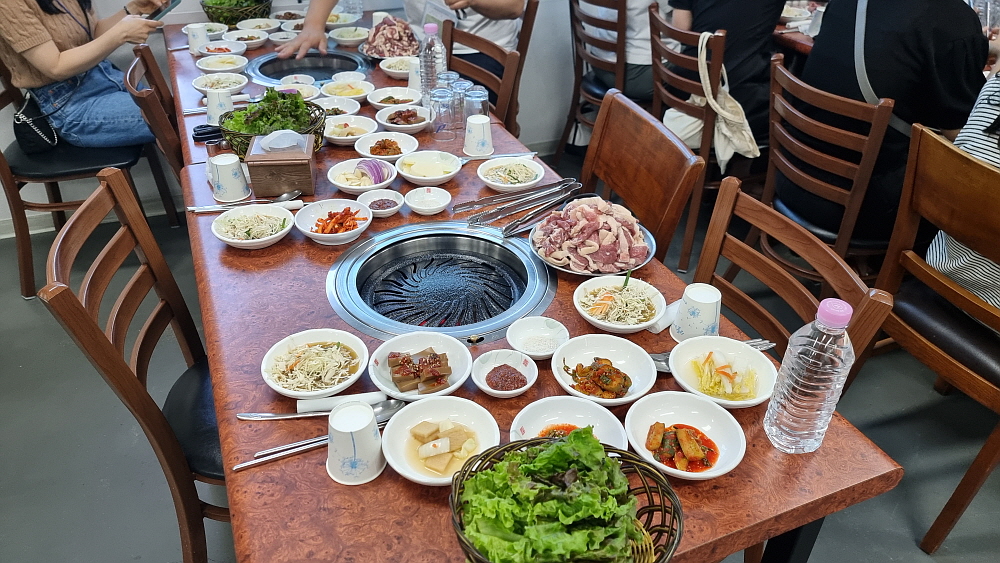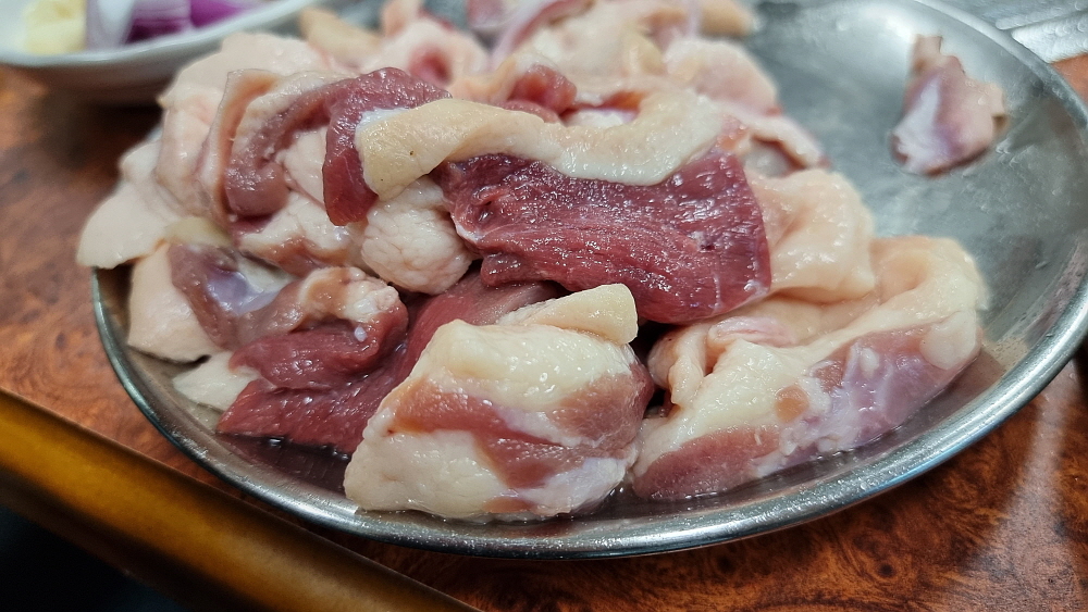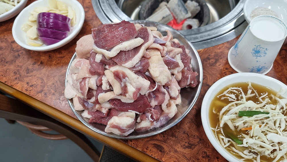 예약하고 갔기 때문에 테이블은 셋팅이 되어 있었다. 그냥 봐도 꽤 신선해 보이는 오리고기가 미리 자리를 잡고 있었다. 거기에 벌건 숯불이 피어 오르고 있었다. 이날 일정이 많아 배도 고프고, 심신이 지쳐있었는데 이런 테이블 차림을 보니 식욕이 마구 솟아 올랐다. 70여 명이 자리를 잡고 앉아 고기를 먹기 시작했다. 평소 오리를 즐겨 먹는 사람들도 있겠지만 보통 그러지 못한 경우가 많아 오랫만에 다들 신선하고 맛난 오리를 먹는다는 생각에 들떠 있는 모습들이었다. 하긴 개인적으로도 거의 6개월 만에 오리고기를 먹는 것 같다.