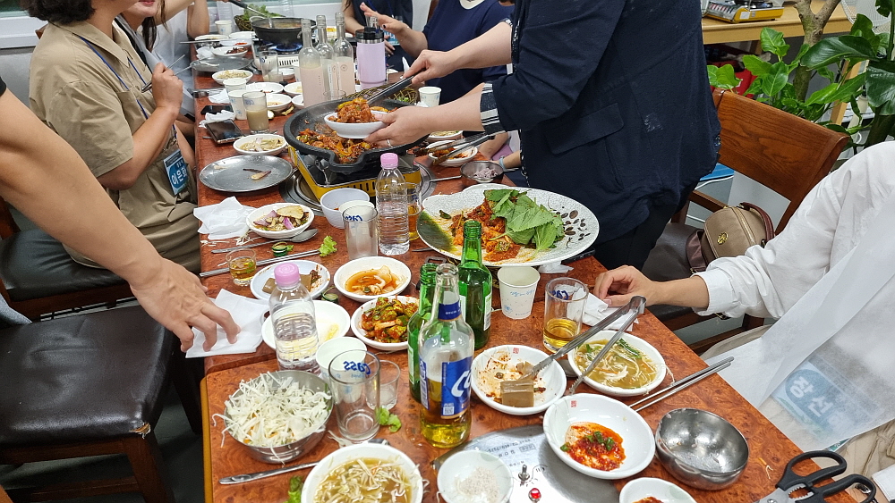 다들 배가 고팠는지 먹는 속도가 엄청 빨랐다. 벌써 로스구이를 끝내고 주물럭으로 넘어간 팀도 있었다. 이건 뭐 전쟁터에 나간 군인들 마냥 전투적으로 먹는 모습이었다. 하긴 점심을 일찍 먹고 벌써 7시 넘었으니 배가 고프고도 남을 시간이긴 하다. 아무튼 막걸리에 소주에 오리고기까지 정말 입안으로 넣기에 바빴다. 사실 오리고기도 돼지고기도 안주로 먹을 경우 이렇게 속도전으로 먹을 것이 아니라 조금씩 구우면서 음미하듯 먹어야 하는데 지금은 그런 분위기가 아니었다. 일단 배를 채우고 보자는 마음들이었다.