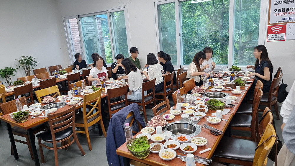 다들 배가 고팠는지 먹는 속도가 엄청 빨랐다. 벌써 로스구이를 끝내고 주물럭으로 넘어간 팀도 있었다. 이건 뭐 전쟁터에 나간 군인들 마냥 전투적으로 먹는 모습이었다. 하긴 점심을 일찍 먹고 벌써 7시 넘었으니 배가 고프고도 남을 시간이긴 하다. 아무튼 막걸리에 소주에 오리고기까지 정말 입안으로 넣기에 바빴다. 사실 오리고기도 돼지고기도 안주로 먹을 경우 이렇게 속도전으로 먹을 것이 아니라 조금씩 구우면서 음미하듯 먹어야 하는데 지금은 그런 분위기가 아니었다. 일단 배를 채우고 보자는 마음들이었다.