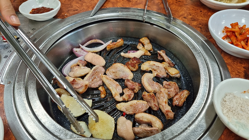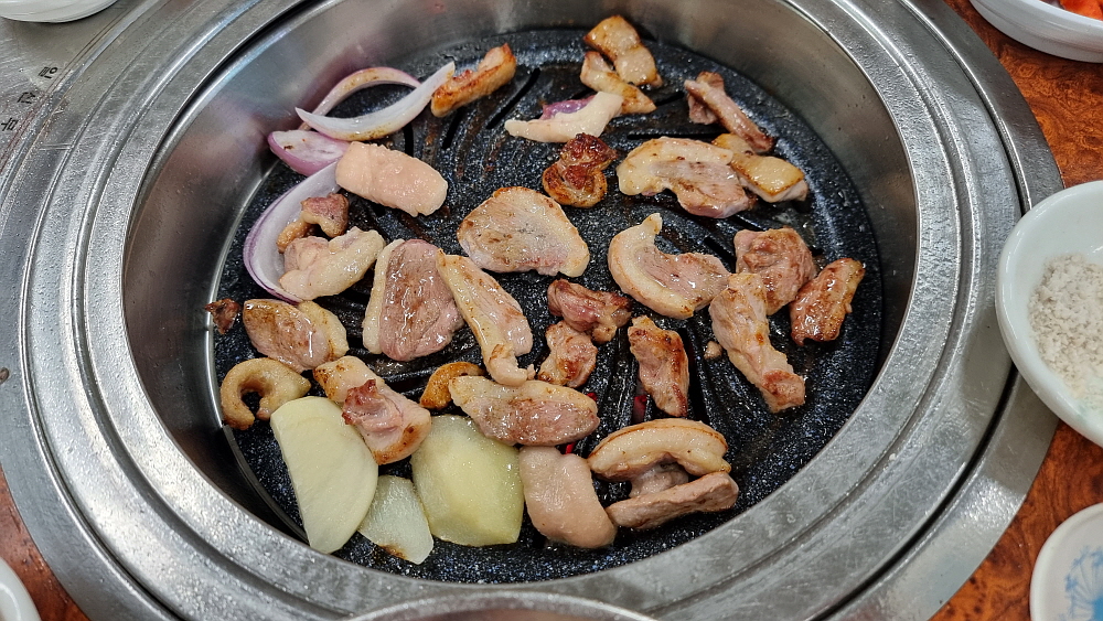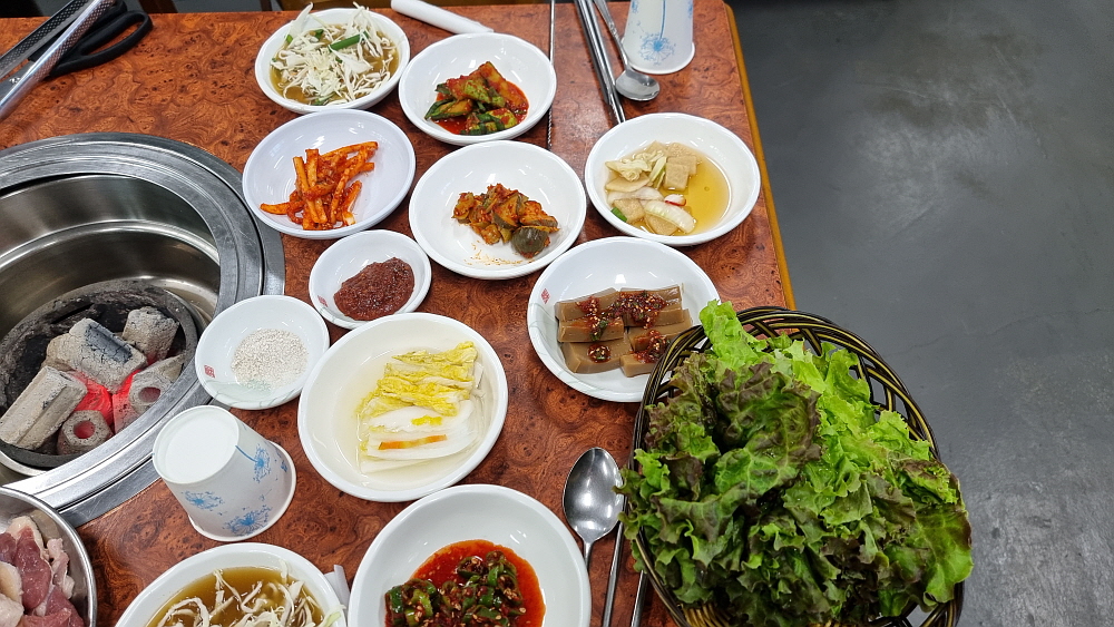 예약하고 갔기 때문에 테이블은 셋팅이 되어 있었다. 그냥 봐도 꽤 신선해 보이는 오리고기가 미리 자리를 잡고 있었다. 거기에 벌건 숯불이 피어 오르고 있었다. 이날 일정이 많아 배도 고프고, 심신이 지쳐있었는데 이런 테이블 차림을 보니 식욕이 마구 솟아 올랐다. 70여 명이 자리를 잡고 앉아 고기를 먹기 시작했다. 평소 오리를 즐겨 먹는 사람들도 있겠지만 보통 그러지 못한 경우가 많아 오랫만에 다들 신선하고 맛난 오리를 먹는다는 생각에 들떠 있는 모습들이었다. 하긴 개인적으로도 거의 6개월 만에 오리고기를 먹는 것 같다.