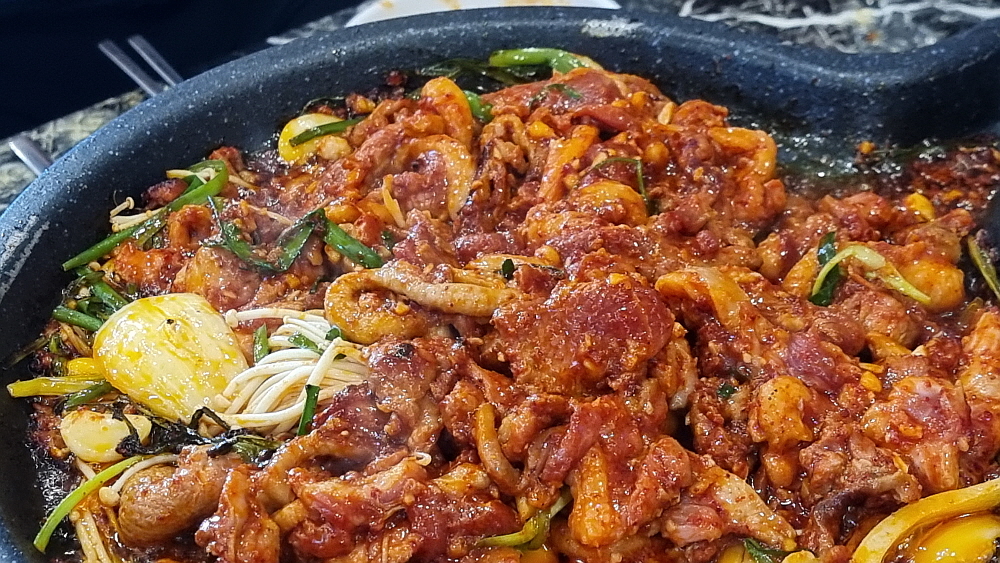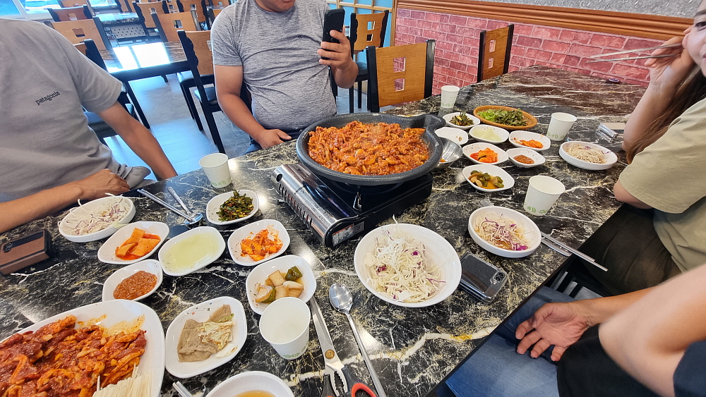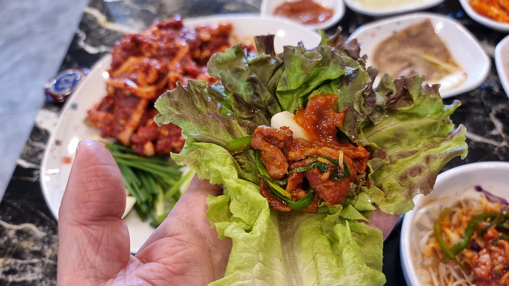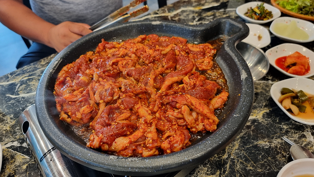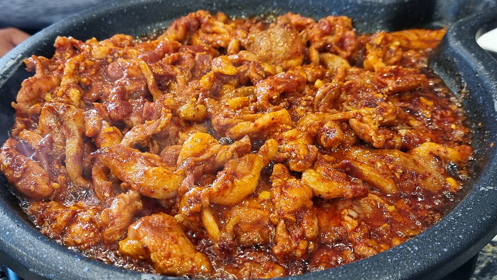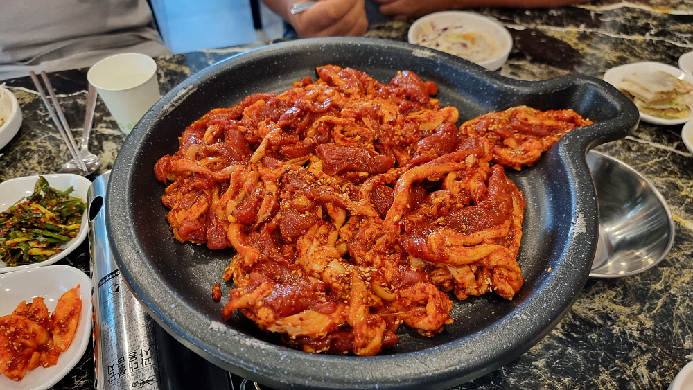 원래 자주 먹었던 오리고기는 생고기였다. 하지만 여기에서는 주물럭 고기를 먹게 되었다. 주물럭이라는 것이 결국 양념고기라는 말인데 오리고기로 주물럭을 먹는다는 것이 흔한 일은 아니다. 그래서 이 자리가 더 귀하게 느껴졌다. 누구나 다 먹는 음식이 아니라 특별하게 먹는 생경한 음식이 주는 잔잔한 감동이었다. 돼지고기 양념은 매운 것도 있고, 달달한 간장 양념도 있다. 심지어 카레에 넣어 먹기도 한다. 과연 오리고기는 어떻게 먹어야 가장 맛이 있을까? 이날 우리가 경험한 것은 매콤한 제육볶음 같은 양념이었다. 이런 양념고기구이는 하얀 쌀밥에 올려 먹어야 제맛이기는 하다.