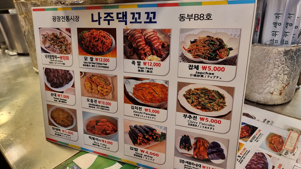 광장시장이나 의정부 제일시장 분위기는 비슷했다. 통로 비슷한 곳에 먹거리 노점들이 있는 것도 아주 익숙한 풍경이었다. 외국사람들의 많이 찾는다는 말이 무색하지 않게 점포들은 모두 일어나 영어 메뉴판을 가지고 있었다. 우리는 그 중에 제일 넓직해 보이는 집으로 갔다. 점포의 이름은 나주댁꼬꼬 란다. 아마도 나주에서 온 사람이 주인장인 모양이다. 나중에 알게 된 사실이지만 이집의 주인장은 음반도 낸 가수라고 한다. 얼굴을 잘 몰라봐서 미안했는데 아무튼 그렇단다. 우리는 이런 주점부리 집에서 먹을 수 있는 것들을 죄다 주문했다. 김밥, 떡볶이, 순대, 빈대떡, 부추전, 오뎅에 만두까지 주문했다.