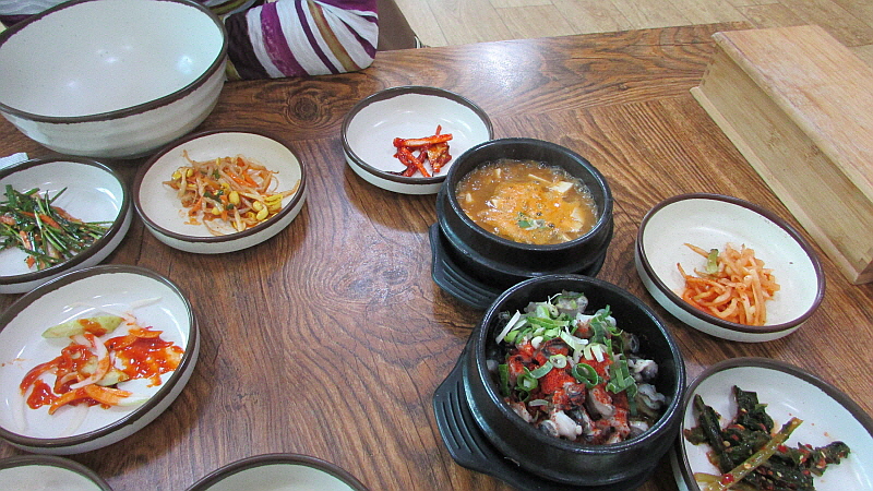 마치 레스토랑처럼 이집은 에피타이저로 호박죽을 조금 내어 준다. 부드럽고 달달한 맛이 일품이지만 내 입엔 좀 과하게 달았다. 요즘은 다들 너무 달게 먹는다. 조금만 덜 달았으면 좋았을텐데 말이다. 그리고 뒤이어 반찬들이 등장했는데 특이한 것은 우렁의 크기였다. 도대체 이렇게까지 큰 우렁이는 본적이 없을 정도로 우렁의 크기가 대단했다. 밑에 있는 쌈장이 보이지 않을 정도로 우렁의 크기는 우람했다. 그리고 나오는 여러 반찬들은 그냥 쌈밥집이 아니라 가게 벽에 붙어 있는 안내글 처럼 쌈으로도 먹고 비빔밥으로도 먹는 이집의 특징을 잘 보여주는 구성이었다. 물론 반찬들도 달달했는데 그건 좀 아쉬웠다. 조금만 덜 달았다면 정말 좋았을 것이다.