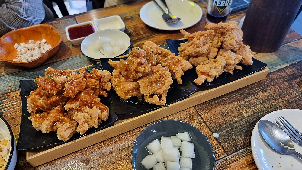 떡볶이 집에서 먹을 때보다 맛이 좋으면 어떻게 하란 말인가? 잠시 뒤 메인인 후라이드 치킨 삼총사가 나왔다. 간장양념 후라이드와 달달한 양념과 매운 양념, 이렇게 세 가지였다. 솔직히 간장양념이 제일 입에 맞았다. 만일 다음에 온다면 이런 구성보다 그냥 간장양념을 한 마리 주문할 것 같다. 바싹 튀겨진 후라이드는 주인장이 정신없이 다니면 만들었겠지만 나름 온도를 잘맞춘 괜찮은 맛이었다. 두툼한 튀김옷도 씹는 식감을 더해주었고, 시간을 잘 맞춘 닭고기도 훌륭한 편이었다. 평소 닭에 그렇게까지 매니아가 아니라 그런지 비싼 브랜드 후라이드나 이런 동네 후라이드나 큰 차이를 모르겠다.