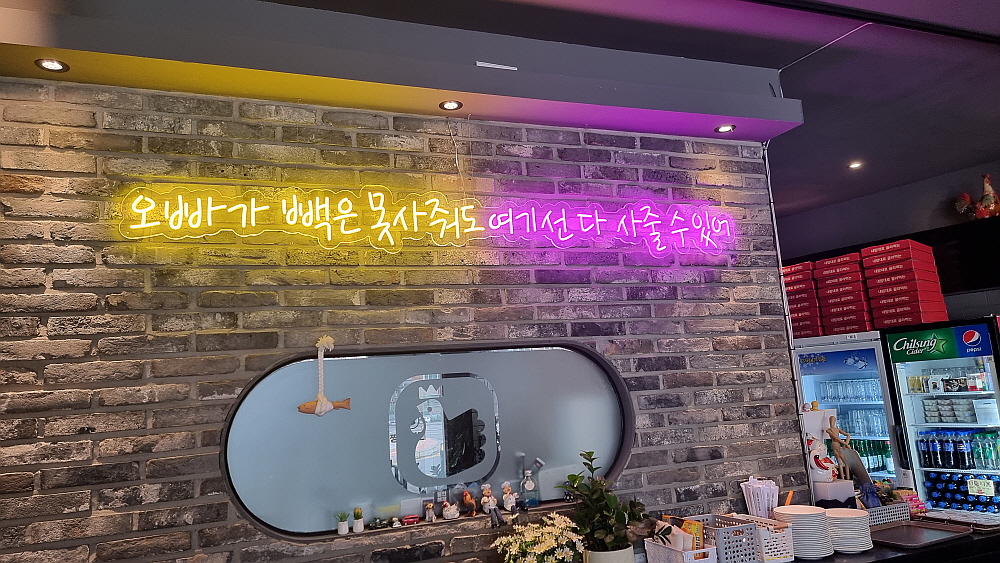 퇴근시간이 되어도 밖은 훤하기 때문에 낮술을 먹는 기분이다. 유한아파트 앞 사거리의 풍경이 그대로 눈에 들어 오는 비주얼 좋은 호프집에 앉아 시원한 생맥주로 목을 축인다니 자체로 신선이 된 기분이다. 솔직히 막상 들어와 맥주 한 잔 마시니 치맥의 진짜 이유가 닭이 아니라 맥주였음을 금새 알 수 있었다. 물론 이렇게 시원하고 알싸한 맥주에 기름진 후라이트 치킨이 더해진다면 당연히 천상의 조합이 될 것이다. 짱닭치킨은 흔한 후라이드 치킨보다 셋트 메뉴로 먹는 것이 더 가성비도 좋고, 다양한 맛을 볼 수 있어 좋다. 그런데 여기 젊은 주인장이 혼자 요리도 하고, 서빙도 하는 모양이다.