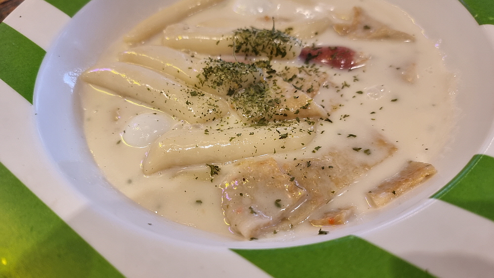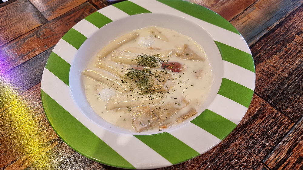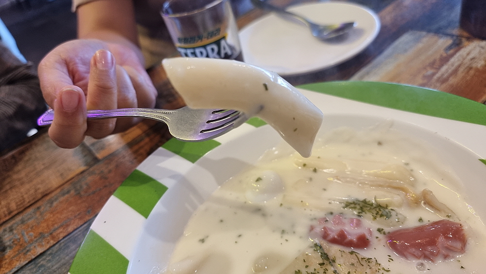 주인장은 비교적 넓은 홀을 누비고 다니느라 여념이 없었다. 그 와중에 손님들을 계속 들어 오고 21세기 대한민국의 자영업은 정말 힘들다. 우린 이름이 가물가물한 셋트메뉴를 주문했다. 후라이드 치킨 두 종류와 떡볶이, 샐러드까지 나오는 것이었다. 이런 구성인데도 가격이 그렇게 비싸지 않았다. 브랜드 치킨 한 마리 시키는 것과 큰 차이가 없었다. 가성비는 정말 짱인 닭집이었다. 여기서 맛도 좋다면 더 이상 바랄 것이 없는 곳이다. 먼저 간단한 먹을거리와 하얀 크림이 덮힌 떡볶이가 나왔다. 물론 만들어진 기성품을 넣어 끓인 음식일 것이다. 그런데 맛이 좋았다. 이런~