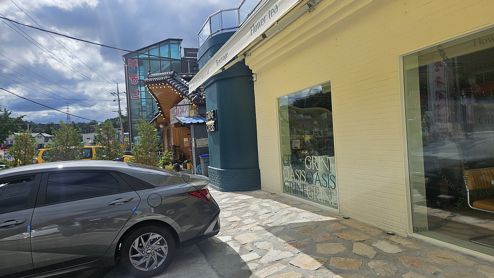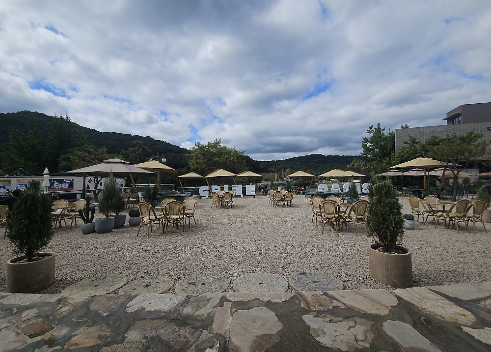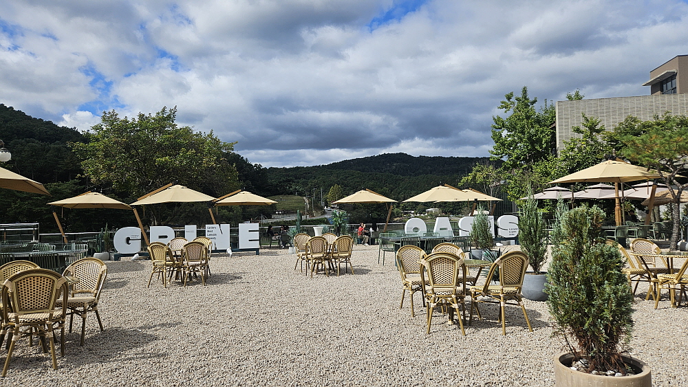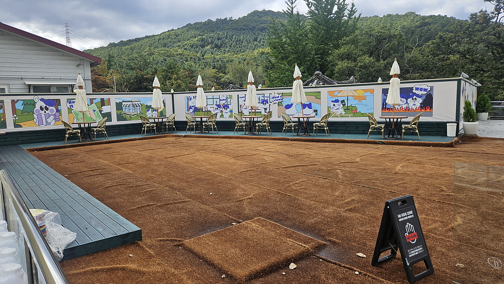 이집이 생긴 것은 그리 오래된 일은 아닌 거 같다. 고모리 저수지 부근에서 가장 인기가 좋다는 투썸플레이스 바로 옆에 있다. 규모로 보면 투썸플레이스에 밀릴 것 같지만 주말엔 오히려 훨씬 장사가 잘 되는 느낌이다. 뭔가 강점이 있는 것이다. 그게 뭘까? 이날 이집의 장점을 들여다 볼 기회가 생겼다. 이집이 이름은 '그리네 오아시스'라는 곳이다. 이름부터 특이하다. 요즘 유행하는 애견을 데리고 입장할 수 있는 애견카페이다. 평일 오후라 그런지 그렇게 손님이 많지는 않았는데 불멍도 할 수 있다는 자리까지 있었다. 카페 안쪽에는 애견 놀이터 공사가 한창이었다.