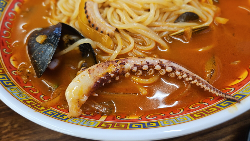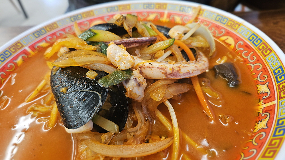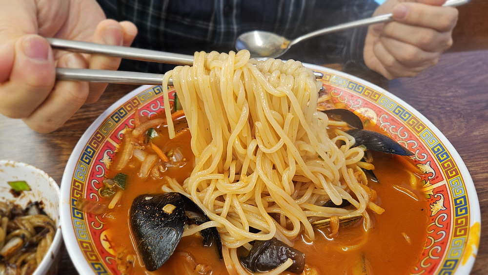 짬뽕 역시 예전에 봤던 붉은 빛이 강렬해 보이는 비주얼이었다. 서둘러 면을 비비면서 보니 신기하게도 간짜장에 적지 않게 많은 돼지고기와 양파가 한데 어우러져 있었다. 그런데 양파와 돼지고기 외의 재료는 파 조금 빼면 없었다. 다른 집들은 감자도 넣고, 양배추도 적지 않게 넣지만 여긴 오로지 돼지고기와 양파만으로 맛을 낸 셈이다. 그런데 이게 아주 훌륭한 조합이었다. 양파의 단맛을 돼지고기의 고소함에 더해 아주 멋진 하모니가 만들어져 있었다. 과연 면도 자가 제면이라더니 쫄깃한 것이 훌륭했다. 보통 다른 중국집들이 불지 말라고 넣는 첨가제로 인해 노랑빛이 도는데 여긴 그냥 새하얀 모습이었다.