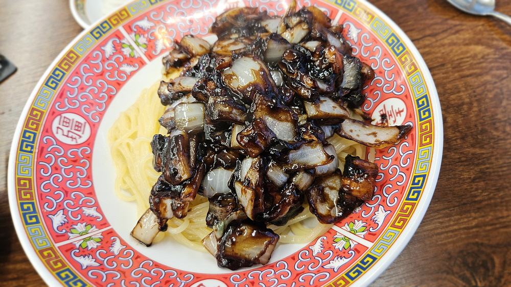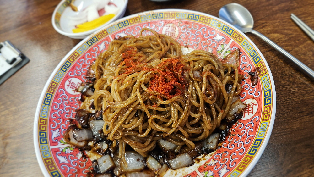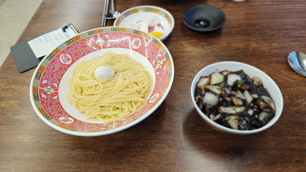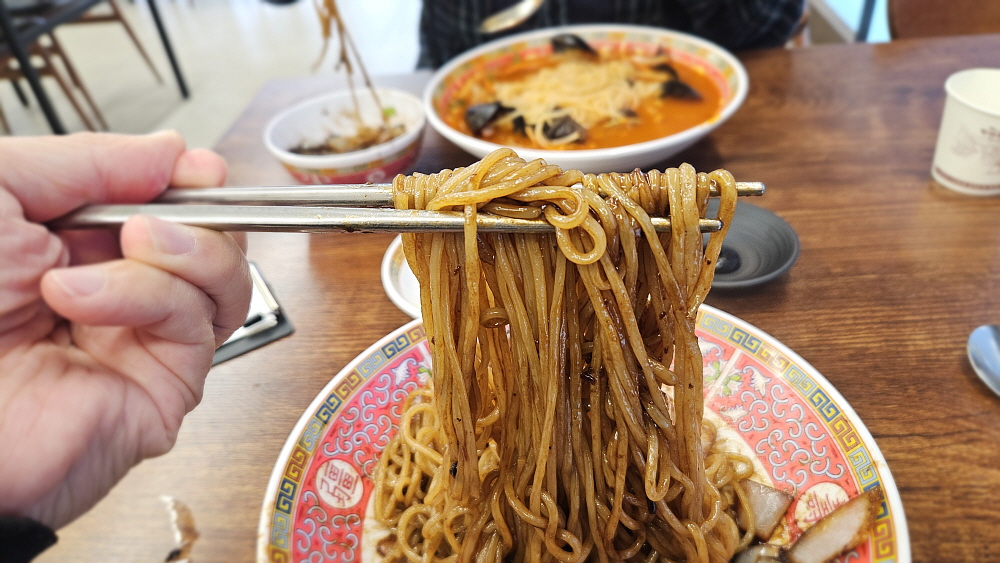 우리는 시그니쳐 메뉴라 할 수 있는 간짜장과 해물짬뽕을 주문했다. 이렇게 주문하여 먹는 한국 사람이 오늘도 수 백만명은 되었을 것이다. 자가제면이라는 말이 눈에 띄였는데 음식을 기다리는 내내 어찌나 웍질하는 소리가 계속 나던지 신뢰가 팍 갔다. 요즘 이렇게 주방에서 웍 돌리는 소리가 진동하는 집이 별로 없는 것 같은데 여긴 예전의 느낌과 감성이 살아 있는 곳이었다. 주변을 보면 대부분 짜장면을 먹고 있었는데 역시 혼자 먹는 밥으로 짜장면은 거의 국룰이 아닌가 한다. 조금 기다리고 있노라니 드디어 우리가 주문한 음식이 나왔다. 간짜장의 자태가 아주 곱고 먹음직했다.