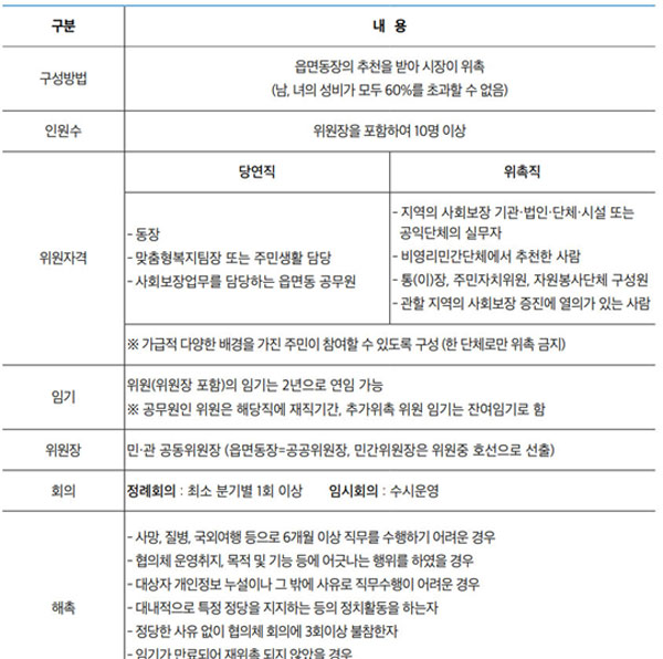 읍면동장의 추천으로 시장 또는 군수가 위촉하는데 관행상 읍면동장이 위촉하는 형태가 많다. 시군구 보장협의체와 달리 위원 구성의 상한선이 없어 10명 이상이라는 규정을 가지고 있다. 꼭 해당 지역에 거주하는 사람이 아니라도 직장이 해당 지역이거나 사업처가 지역이라는 관계성을 가지고 있으면 위원이 될 수 있다.
