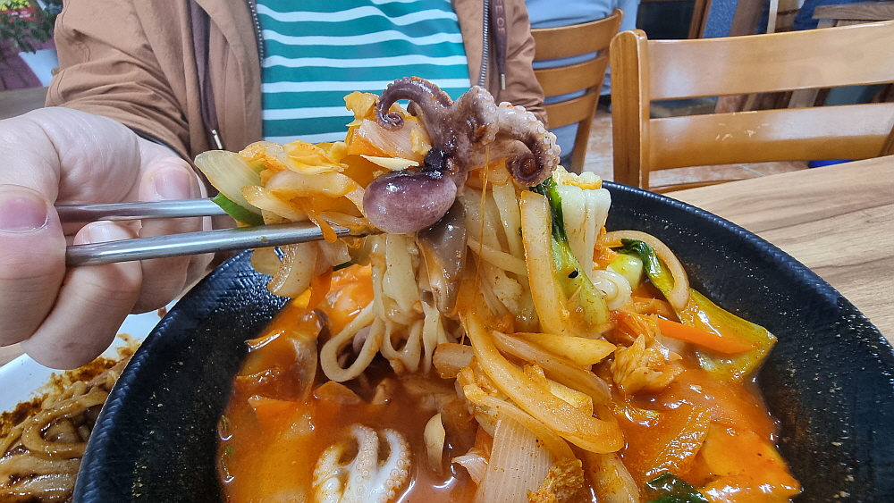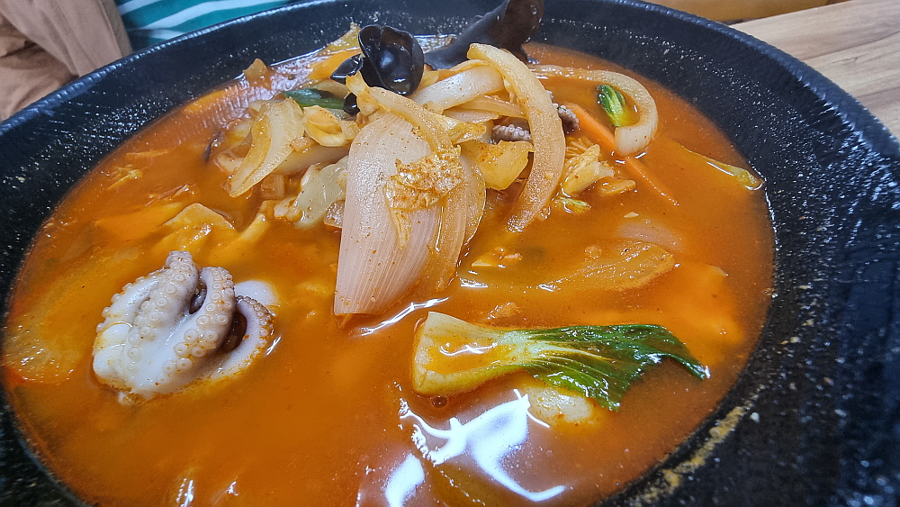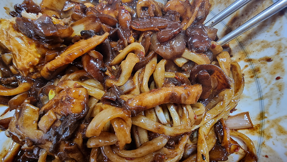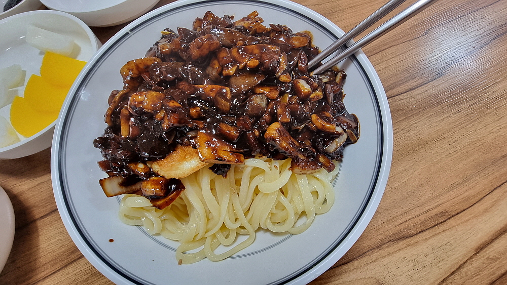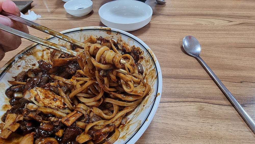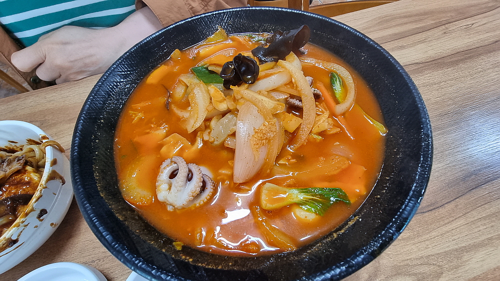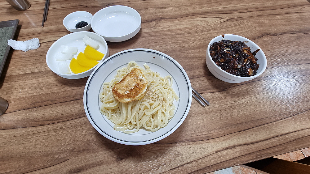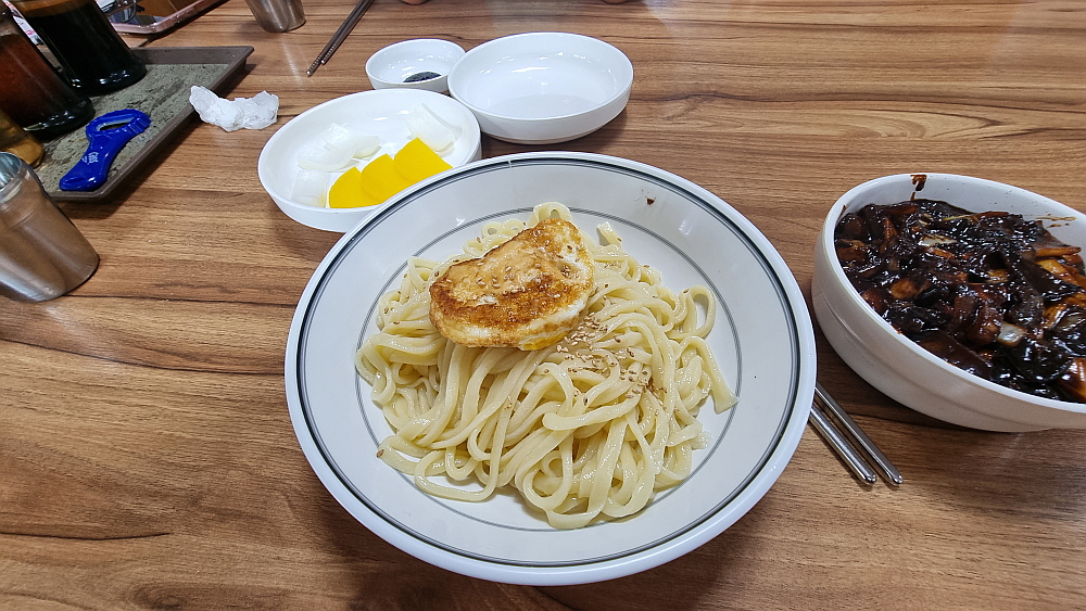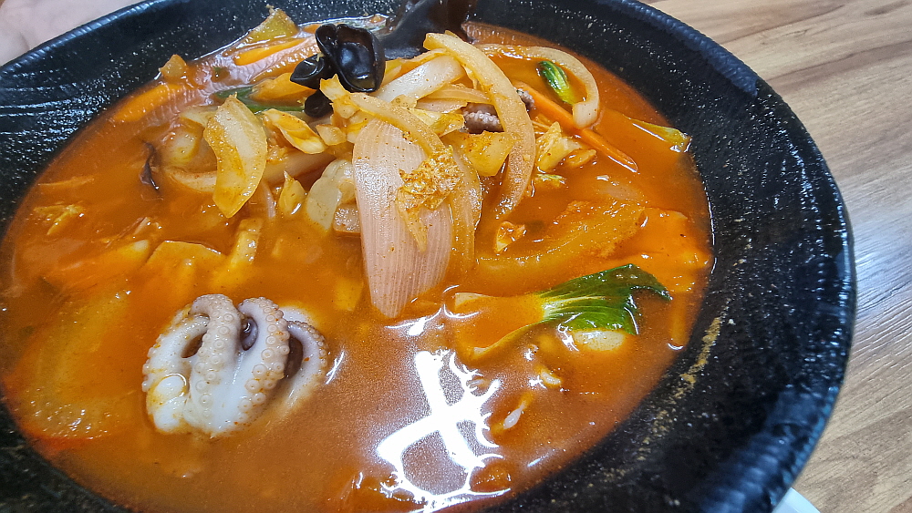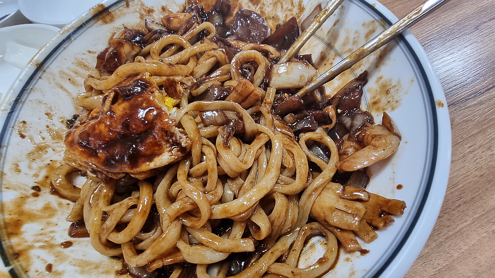 우리가 주문한 것은 삼선짜장과 삼선짬뽕이었다. 둘 다 중국집에서 가장 흔하게 볼 수 있는 메뉴들이다. 이런 시그니쳐 메뉴를 먹어봐야 그집의 진정한 포스와 맛을 알 수 있는 법이다. 간판에 씌여 있는대로 정말 면은 수타면이었다. 거기에 감동적이게도 계란 후라이가 하나 떡 하니 자리를 잡고 있었다. 분명 웍에서 기름 충분히 두르고 튀기듯 만들어 낸 계란 후라이일 것이다. 면의 두께가 서로 달라 분명 수타로 만든 면임을 알 수 있었다. 간짜장 양념이 많은 편이어서 우린 나누어 먹었다. 이래도 면을 비비기에 충분한 양이었다. 진한 검은색이 식욕을 자극하는 제대로 된 짜장면이었다.