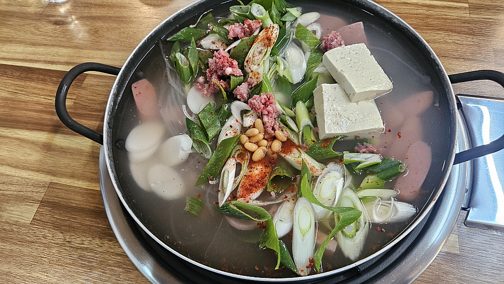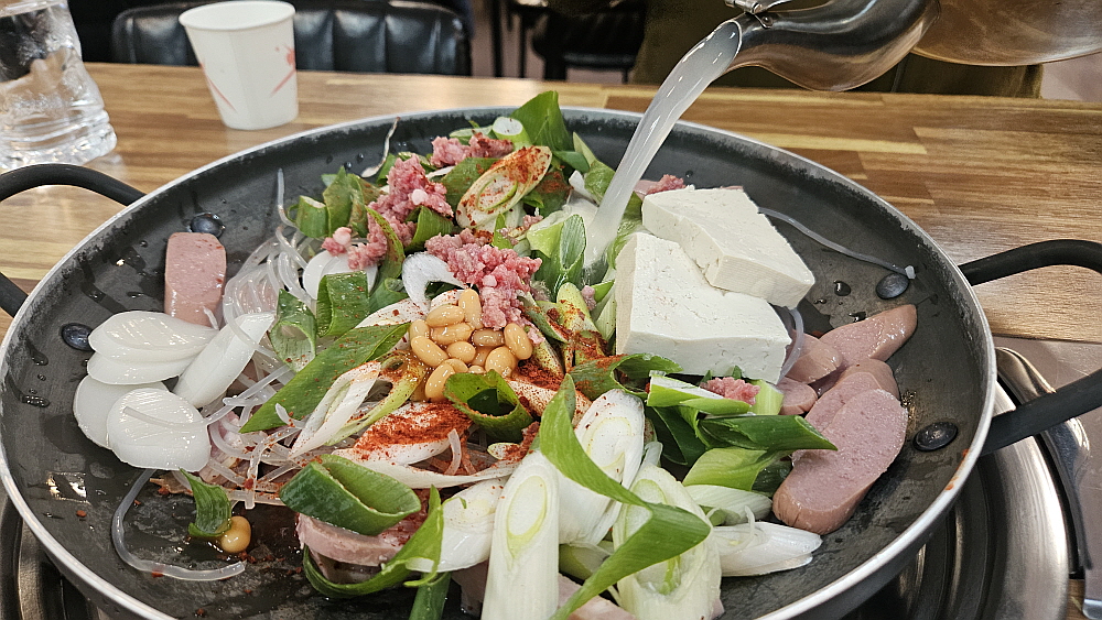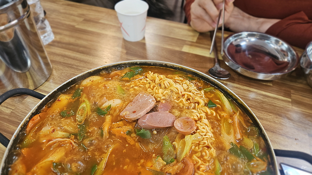 요즘 의정부 부대찌개 골목의 가격은 거의 일 인분에 12,000원 정도다. 이집은 10,000원 이니까 꽤 착한 가격이다. 요즘 부대찌개를 만 원에 먹을 수 있는 집이 있다는 사실만으로도 와 볼만한 가치가 있는 집이다. 우리는 국룰처럼 받아 들여지는 대로 부대찌개 2인분과 라면사리를 주문했다. 부대찌개에는 라면 사리가 꼭 들어가는 법이다. 이렇게 하지 않는 사람은 거의 보지 못했다. 대부분의 재료들이 살아 있는 채로 와서 손님 테이블에서 익는 방식이다. 뽀얀 육수를 불을 켜고 넣어 주는 방식은 의정부 부대찌개 골목의 그것과 비슷했다. 재료들을 보면 분명 의정부 방식이라는 것을 알 수 있다.
