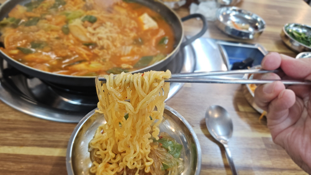 김치찌개 비슷한 비주얼이 되는 것이 바로 의정부 방식이다. 특이한 것은 민치라는 다진 소고기가 들어가는데 이집에서는 마치 생고기를 넣어 주는 것 같은 모양이었다. 분명 이것도 통조림에 있는 것을 넣어 준 것일텐데 어떻게 이런 비주얼이 나오는지 신기했다. 소시지와 햄만 왕창 들어가는 평택의 부대찌개와는 다른 음식이라 하겠다. 우린 어릴 때부터 이런 의정부 식의 부대찌개를 먹어와서인지 평택식의 부대찌개보다는 의정부 방식이 더 입에 맞는 것 같다. 그렇게 어느 정도 시간이 지나면 드디어 찌개가 끓기 시작한다. 보통은 라면사리를 같이 넣고 끓이기 시작한다. 가장 먼저 라면을 먹기 위함이다.