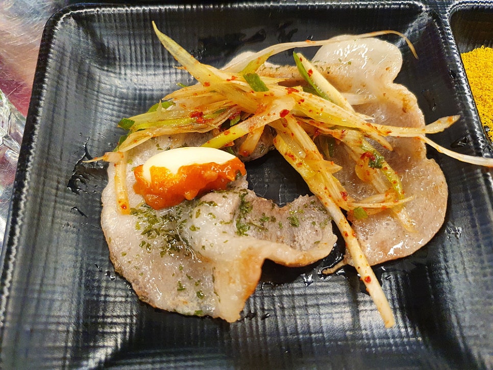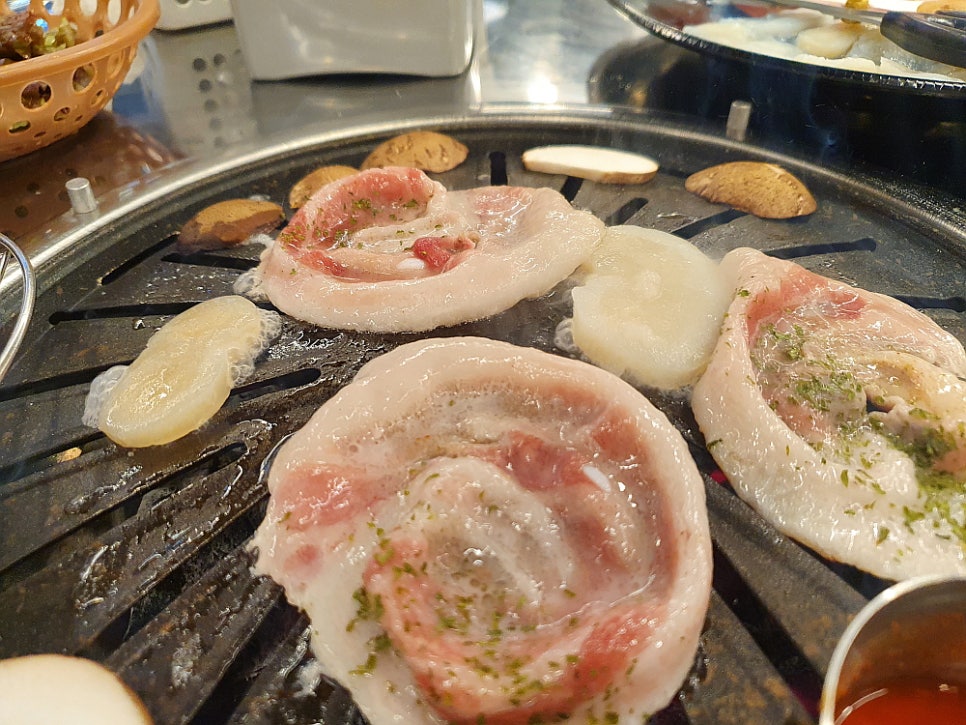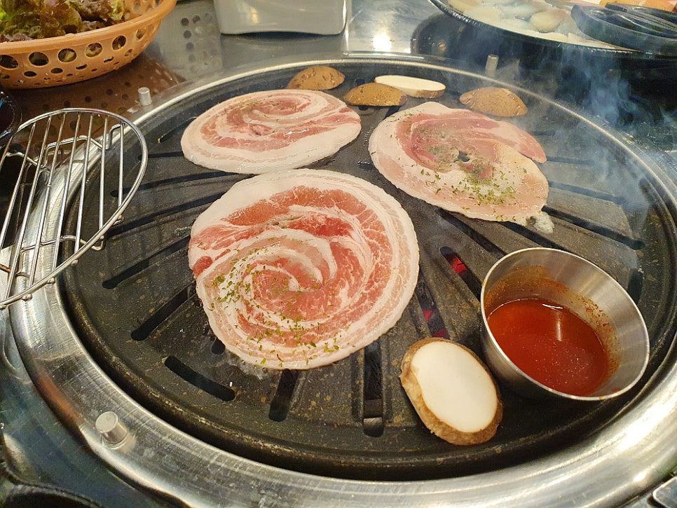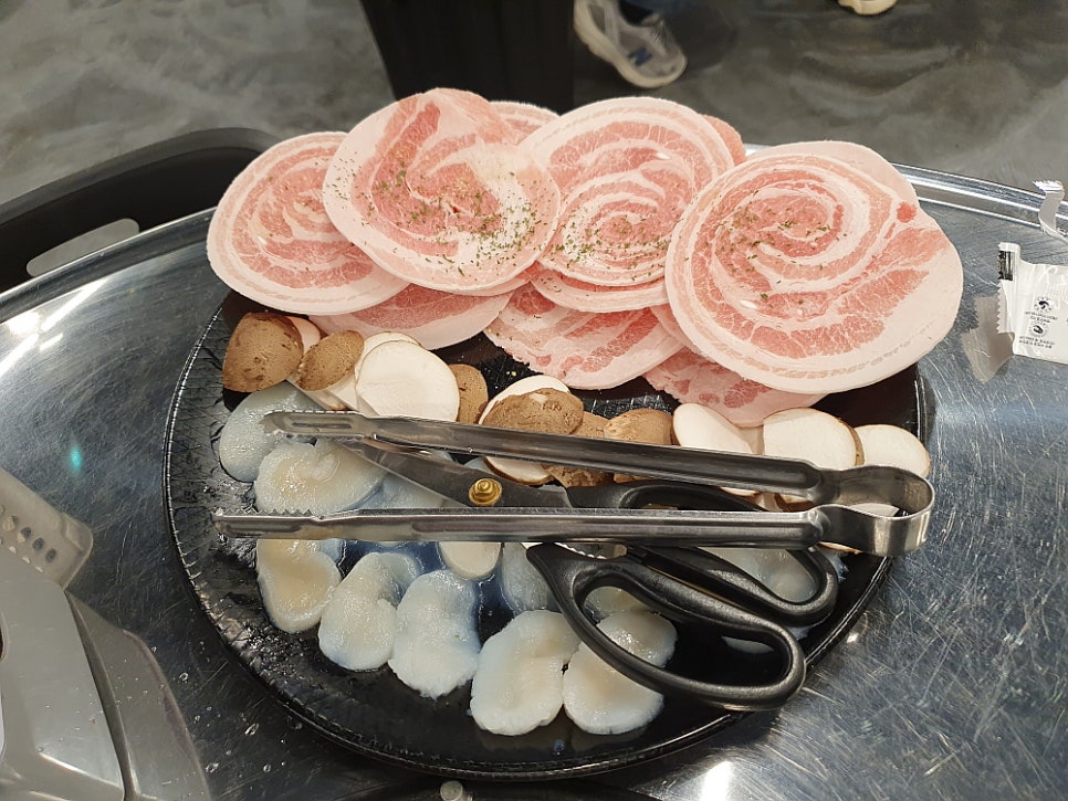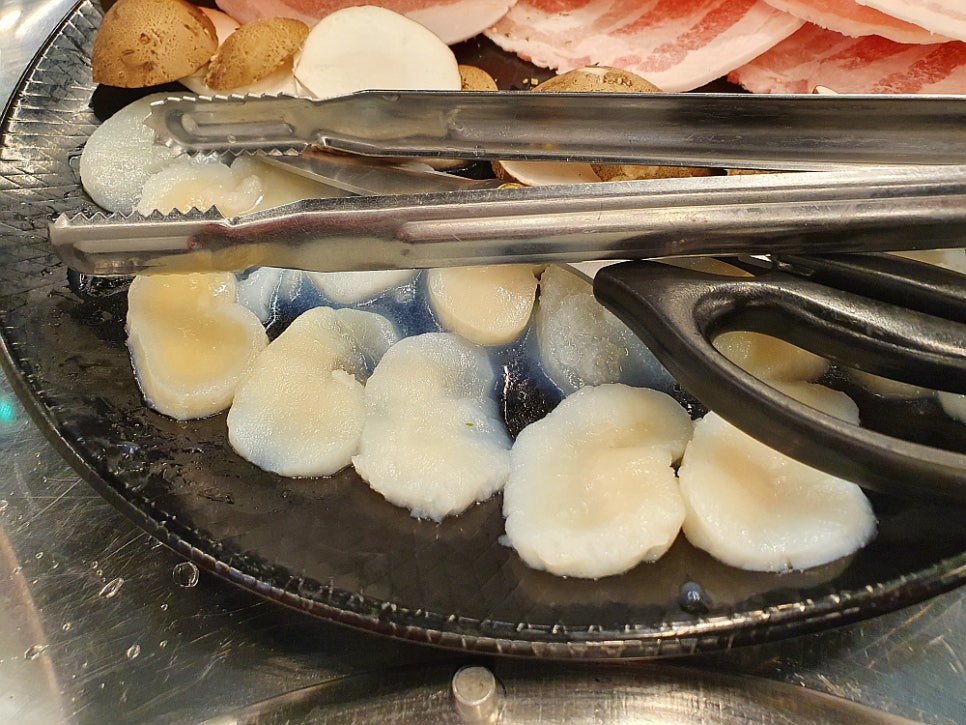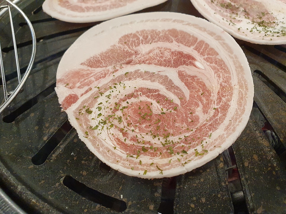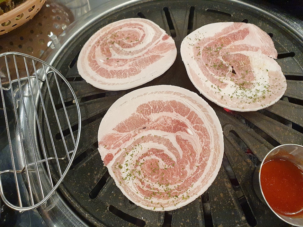 우리는 삼합 한 판이라는 메뉴를 주문했는데 솔직히 삼겹살보다 조개 관자가 더 좋았기 때문이다. 관자를 함께 구워 먹는 삼겹살 집은 본적이 없기에 신기한 마음에 주문했다. 그런데 막상 나온 삼겹살을 마주하니 이건 도대체 뭐지? 하는 생각이 들 정도로 아주 묘한 모습이었다. 어째서 삼겹살이 이렇게 동그란 모양을 하고 있단 말인가? 사실 삼겹살을 기왕에 먹을라 치면 차라니 생 삼겹살 보다는 냉동 삼겹살이 더 낫다고 생각했다. 훨씬 빨리 익는데다 고소한 맛도 더하고, 기름은 덜 하니 말이다. 그런데 이집의 삼겹살 모양은 분명 냉동 같긴 한데 어떻게 이렇게 만들었는지 궁금할 정도로 신기한 것이었다.