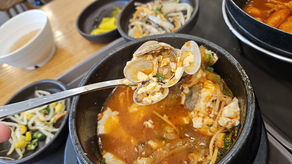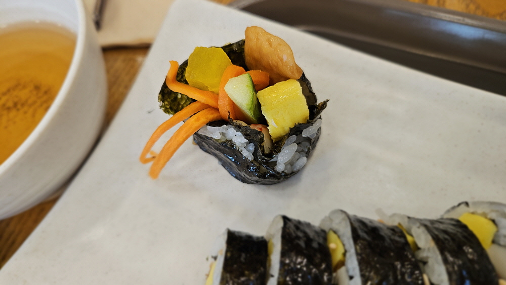 바지락 조개가 엄청 들어간 순두부 찌개는 어린 시절부터 먹었던 가장 익숙한 음식이긴 하다. 어머니께서도 순부두 찌개를 자주 끓여주셨는데 그 때도 이렇게 매콤했는지 기억이 잘 나지 않는다. 아마도 두부라는 음식은 우리네 영혼을 채워주는 생활의 한 부분 같은 음식이 아닐까 한다. 생활이 넉넉치 않은 집에서도 늘 상에 두부 반찬은 자주 올라가곤 했다. 부족한 단백질을 두부로 보충하는 셈이다. 김밥집에서 참 별 생각을 다한다! 김밥의 맛이 좋아 순두부와의 궁합도 꽤나 훌륭했다. 이런 조합이라면 개인적으로 자주 배달을 시키게 되지 않을까 싶다.