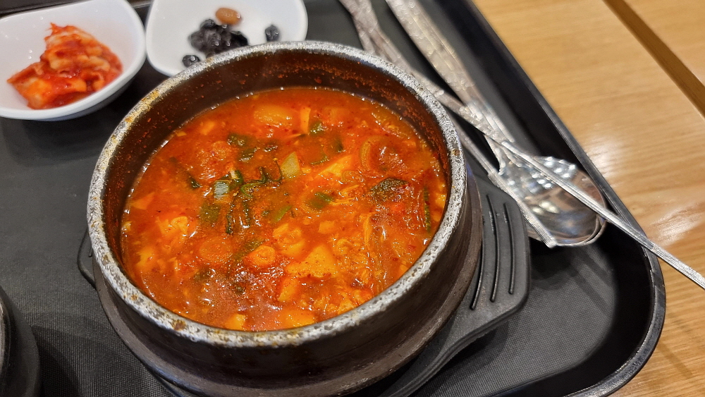 12,000원 짜리 순두부찌개는 정말 단촐했다. 작은 뚝배기에 들어간 순두부찌개와 밥 한 공기, 콩자반 몇 알, 그리고 김치 몇 점이 다였다. 실망스러운 비주얼이었다. 그런데 맛은 이것도 영 달랐다. 아주 진한 국물에 적당히 칼칼한 것이 정말 괜찮은 맛집 순두부찌개였다. '어라~ 보기랑 많이 다르네...' 하는 생각을 했다. 이것도 가격은 비싼 편이지만 맛은 수준급이라 다행이었다. 결론적으로 보면 가성비는 매우 안 좋지만 맛은 훌륭하다는 것이다. 공항 푸드코트에서 맛난 음식을 먹은 기억이 별로 없는데 이날은 문 연 가게도 별로 없는 가운데 만족스러운 맛을 볼 수 있었다.