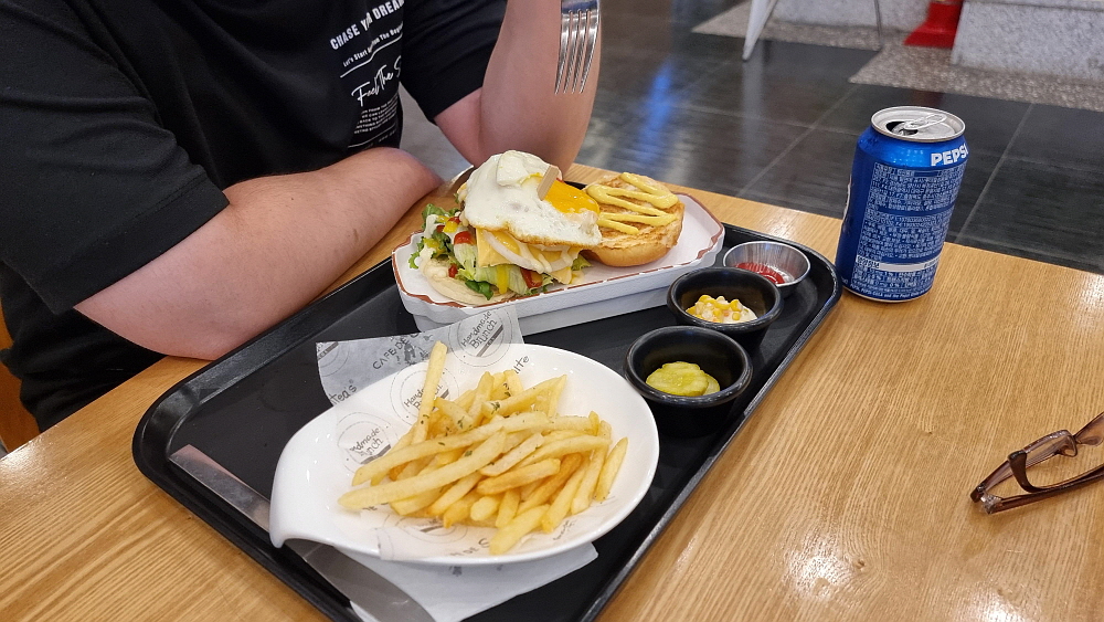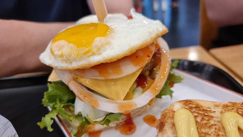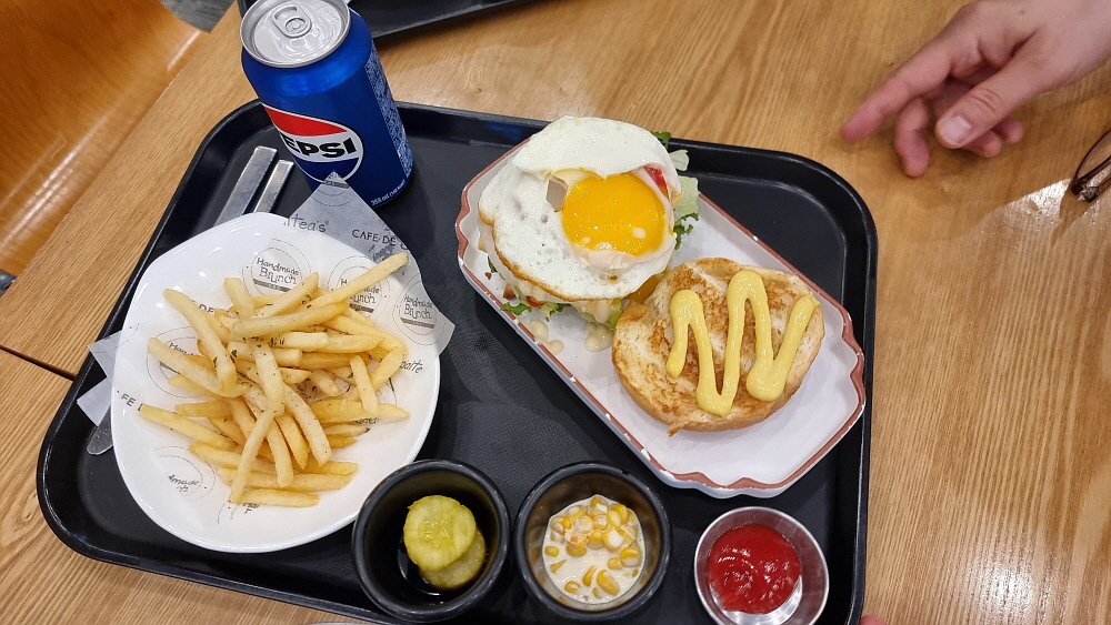 샌드위치 가게에서 만든 버거가 나왔다. 작은 빵 위에 패티와 계란후라이와 야채와 치즈, 토핑 등등을 올리는 빵을 덮어 한 입에 먹는 것이 불가능한 사이즈가 되었다. 이건 그냥 들고 먹는 버거가 아니라 함께 준 포크와 나이프로 잘라 먹는 스테이크 같은 음식이다. 그런데 가격에 불만이 있음에도 불구하고 맛이 아주 좋았다. 다행이다. 가격이 비싼데 맛까지 없었다면 이런 불상사가 또 있을까? 그래도 푸짐한 편이라 간단한 아침이라 하기에 좀 버거울 정도의 양이었다. 가성비는 별로지만 맛과 구성은 그런대로 고급지고 괜찮았다. 나름 나쁘지 않네...